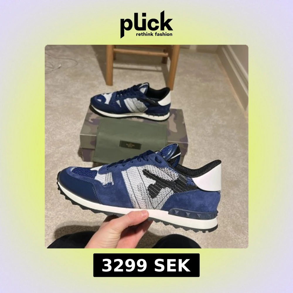 Snygga Valentino Rockrunner sneakers i blått, vitt och svart med camouflagemönster. Ovandel i mocka och textil, detaljer i skinn och nitar vid hälen. Klassisk rund tå, snörning och platt sula. Perfekta för dig som vill sticka ut med exklusiva och trendiga sneakers. HELT NYA
