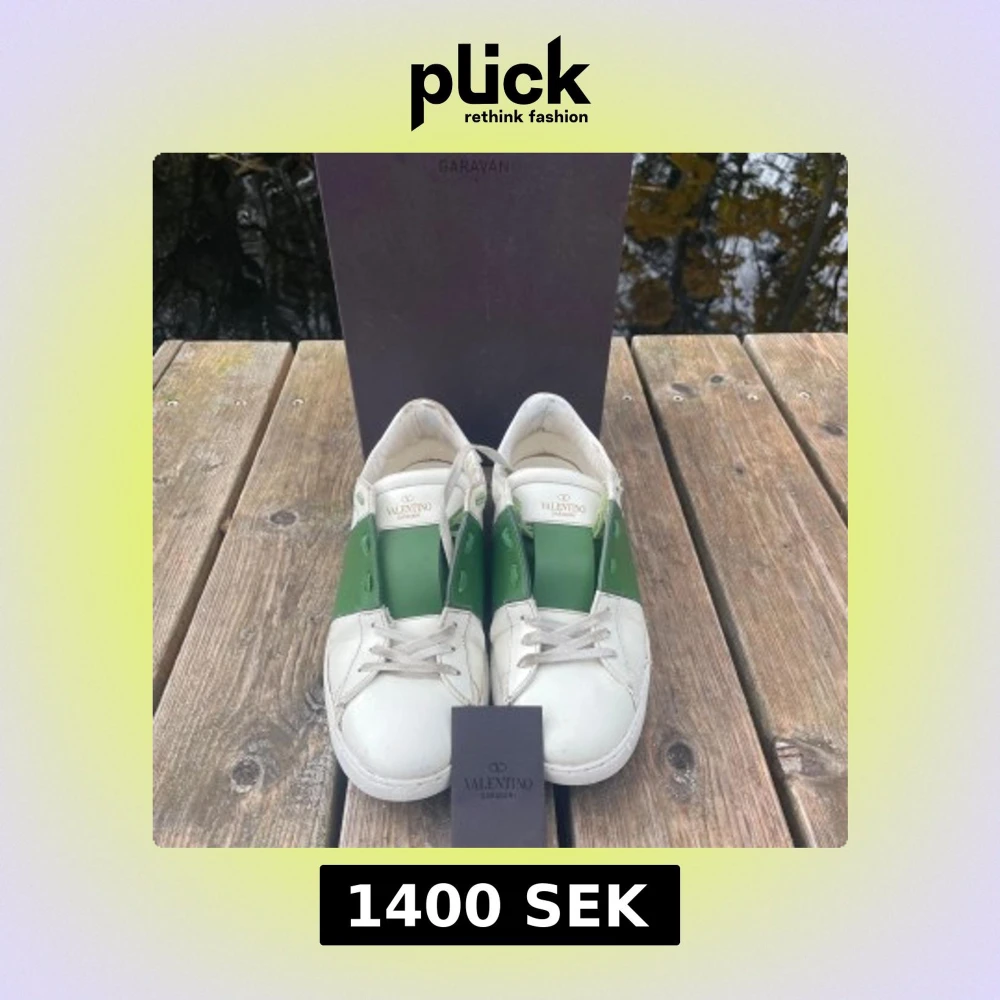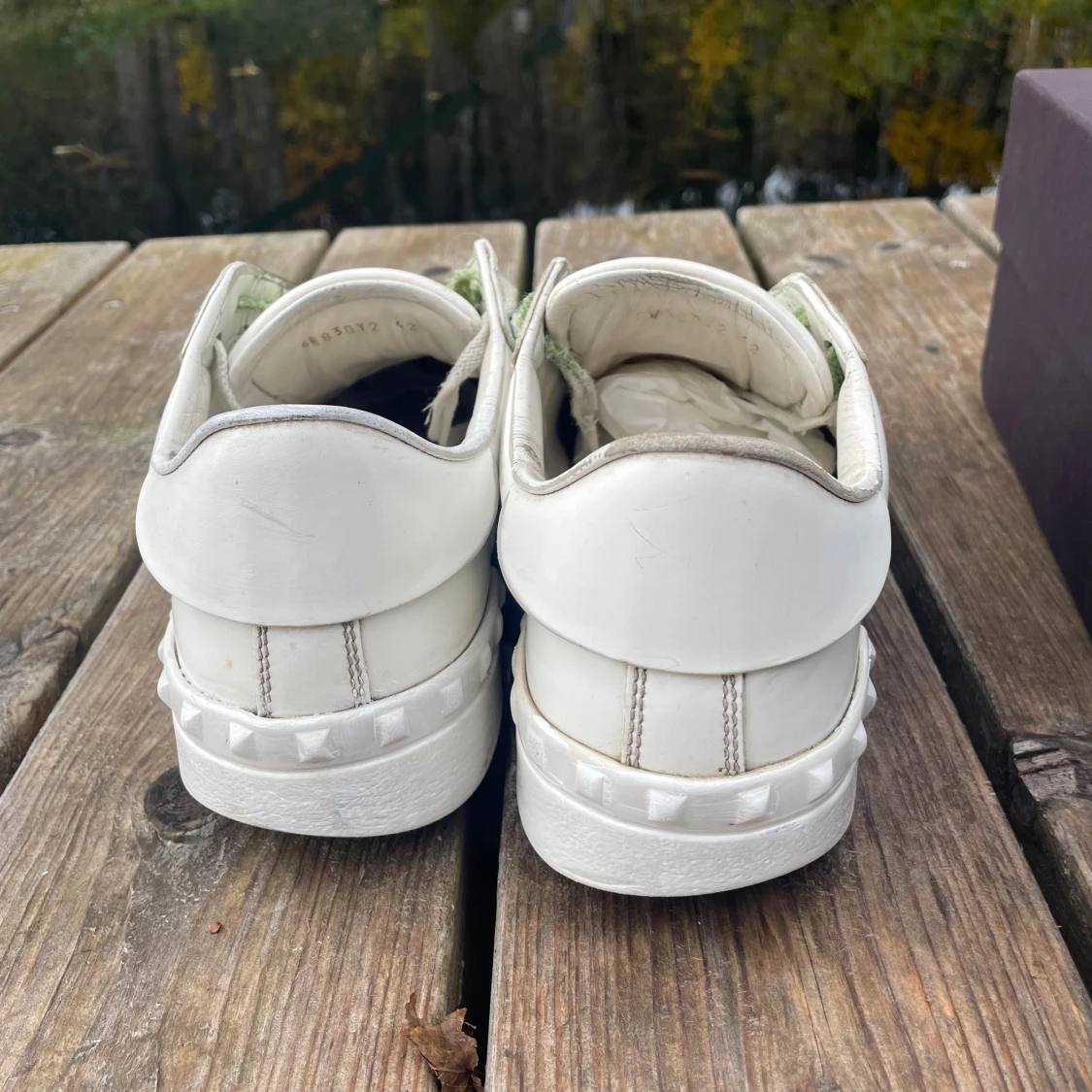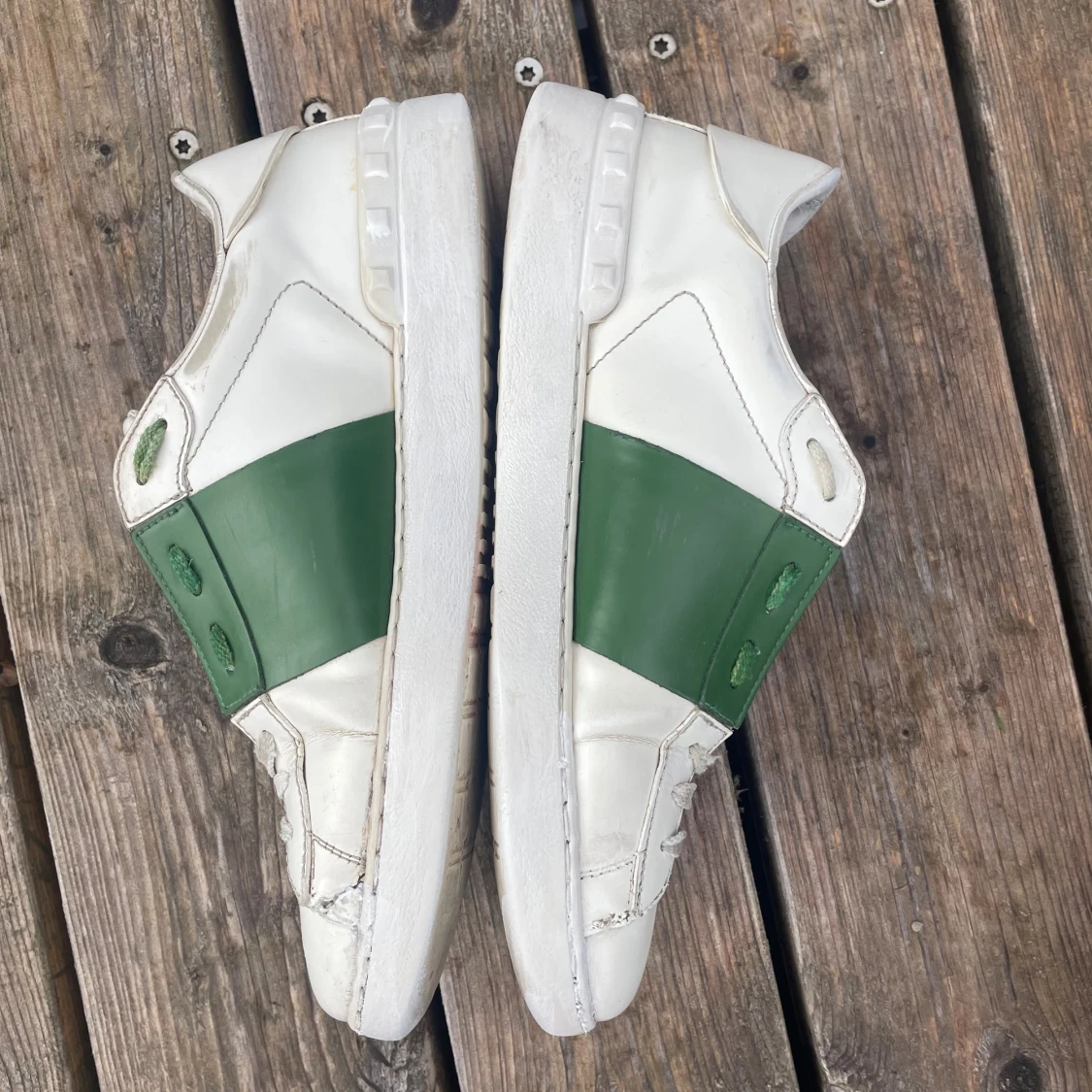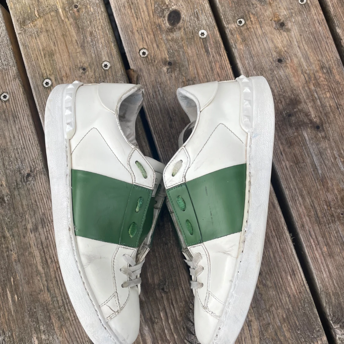 Snygga Valentino Garavani Open sneakers i vitt skinn med bred grön läderdetalj över sidan. Klassisk rund tå, platt sula och snörning framtill. Ikoniska nitar på hälen ger extra edge. Perfekt för dig som gillar exklusiva streetwear-vibbar.