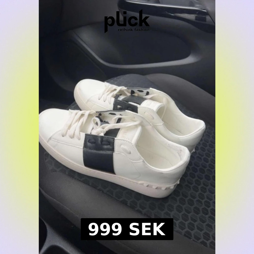 Säljer ett par snygga Valentino Open sneakers i vitt med en bred svart läderdetalj över snörningen. Skorna har platt sula, rund tå och coola nitar på hälen. Perfekt för dig som gillar stilrena och lyxiga sneakers med unik design.VILL FÅ SÅLT!