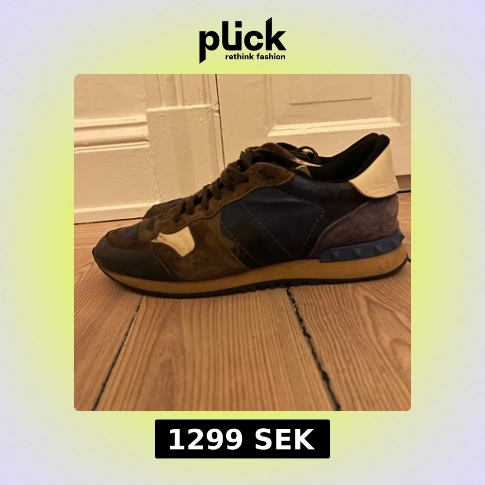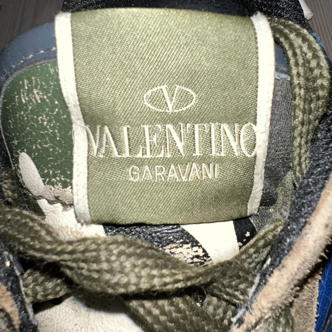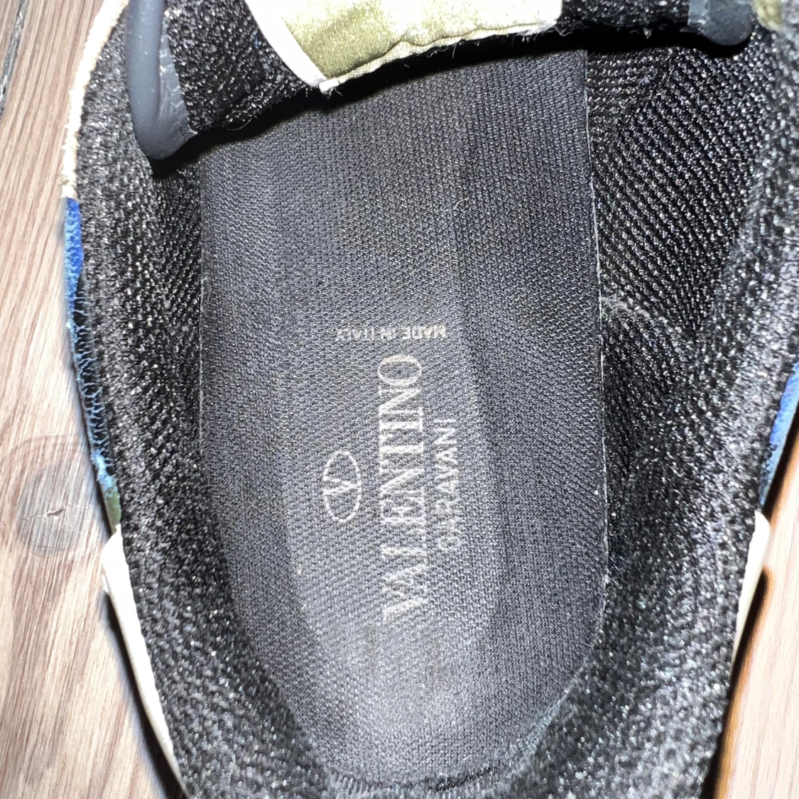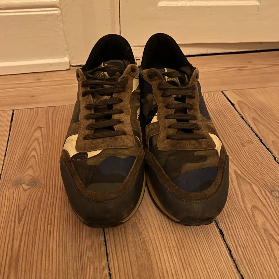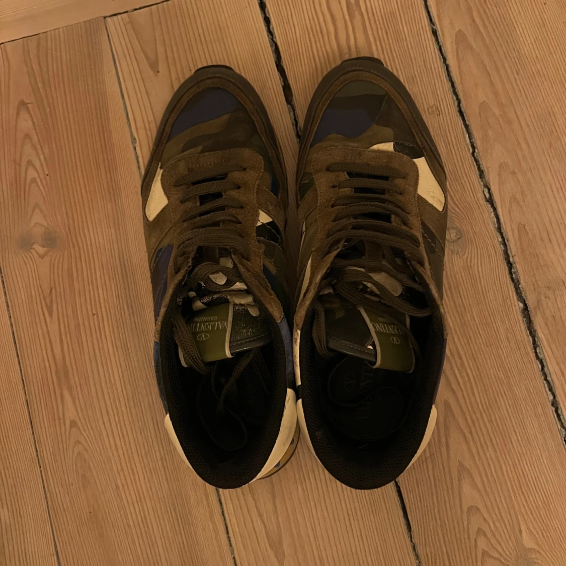 Säljer ett par Valentino Garavani Rockrunner sneakers med camouflagemönster i grönt, blått, beige och svart. Skorna har snörning, platt sula och detaljer i mocka och skinn. Ikoniska nitar på hälen och rund tå. Dessa är i storlek 43 och kan sitta bra i 44. Skick 7,5/10