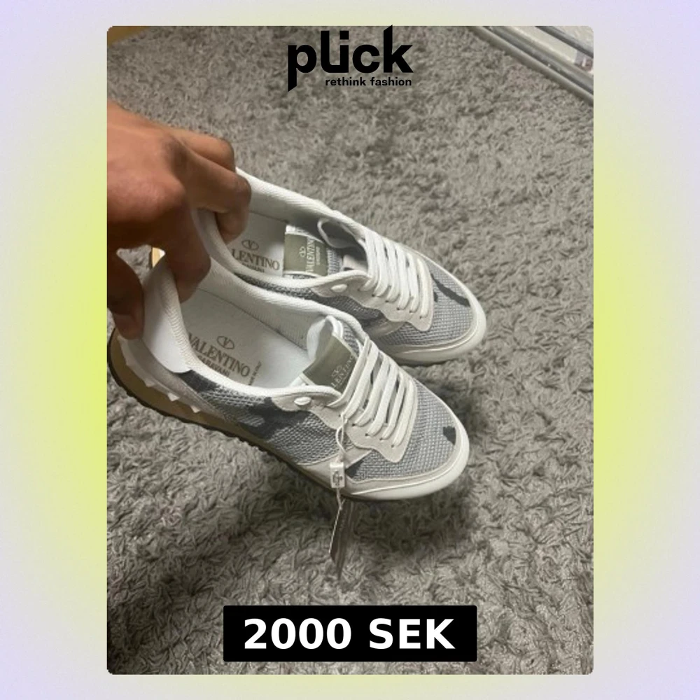 Snygga Valentino Rockrunner sneakers i beige, vitt och grått med kamouflagemönster. Skorna har vita snören, mesh- och mockadetaljer samt den ikoniska nitar på hälen. Sulan är beige med gummidetaljer och logga på plösen.