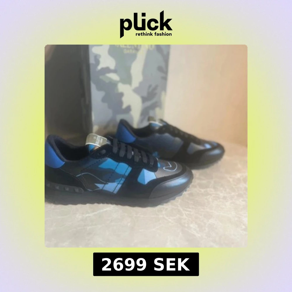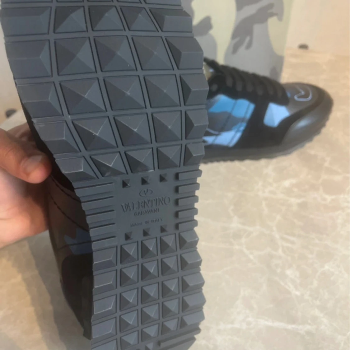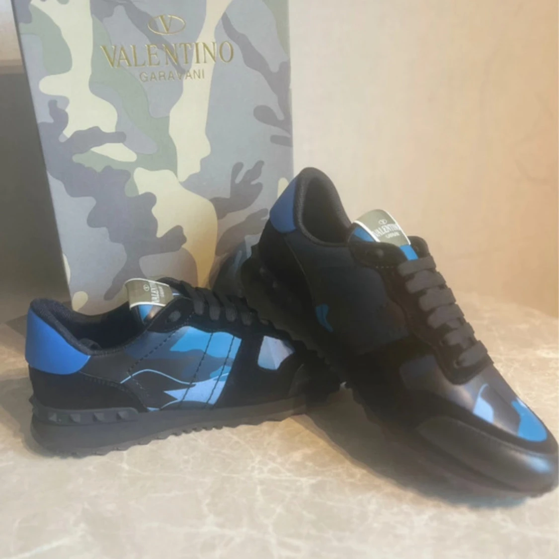 Snygga vinter Valentino Garavani Rockrunner sneakers i svart och blått med coolt camouflagemönster. Skorna har svarta snören, detaljer i skinn och mocka samt en robust sula med nitar. Perfekta för dig som vill sticka ut med stilrena och trendiga sneakers.