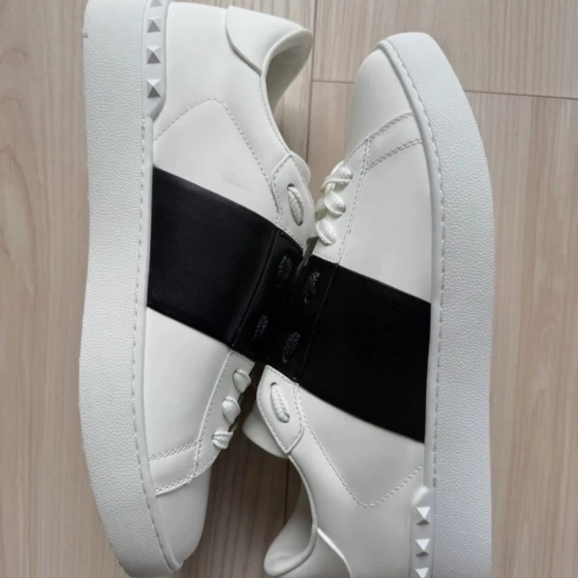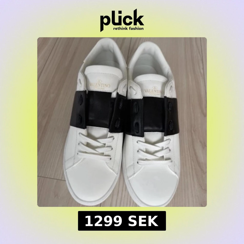 Snygga vita Valentino Garavani Open sneakers med bred svart läderdetalj över snörningen och coola nitar på hälen. Klassisk rund tå och platt sula, tillverkade i skinn med vita skosnören. Perfekt för dig som gillar exklusiv och stilren design.