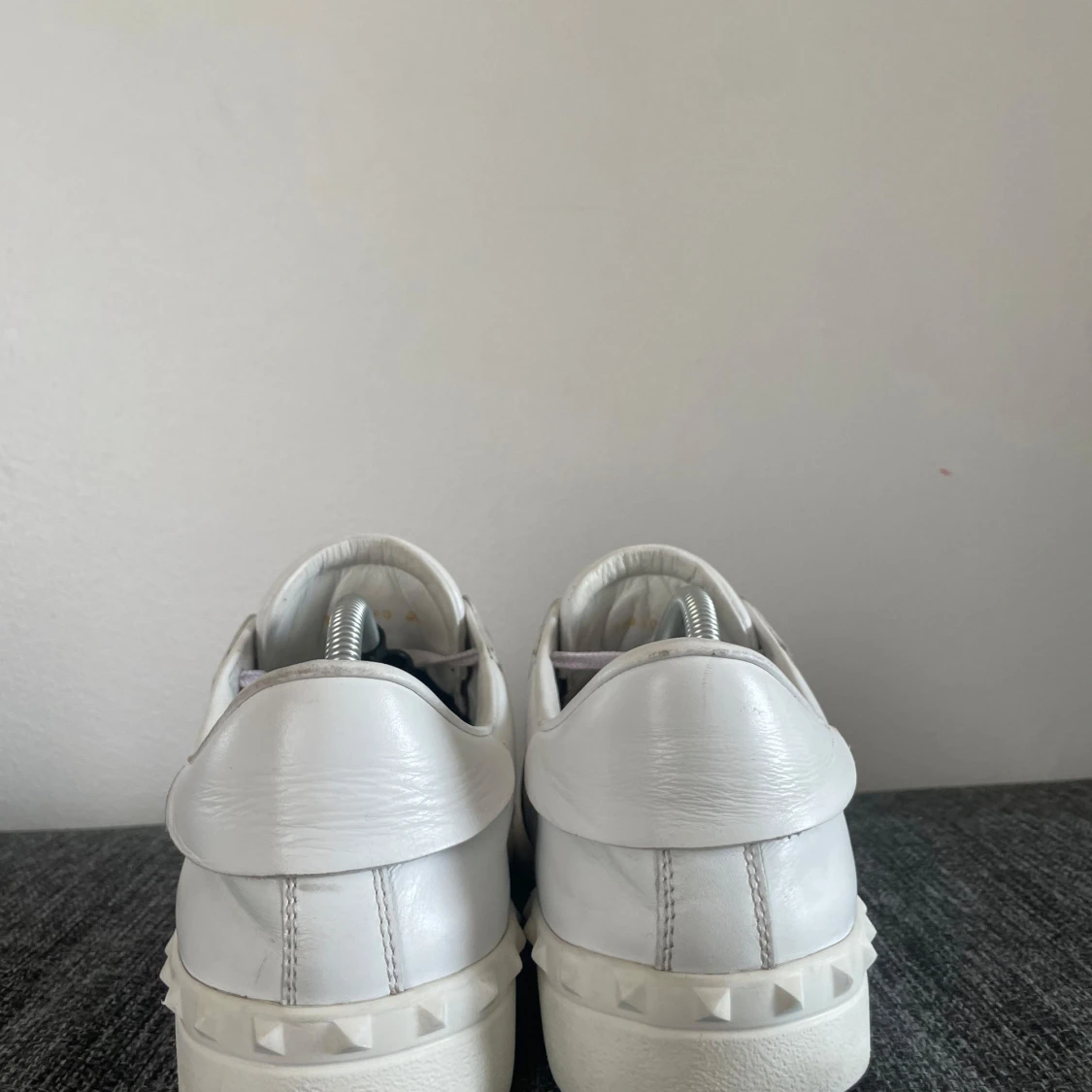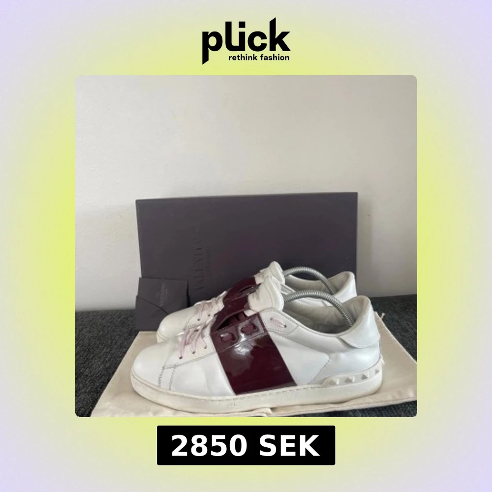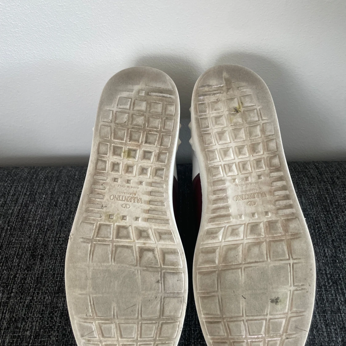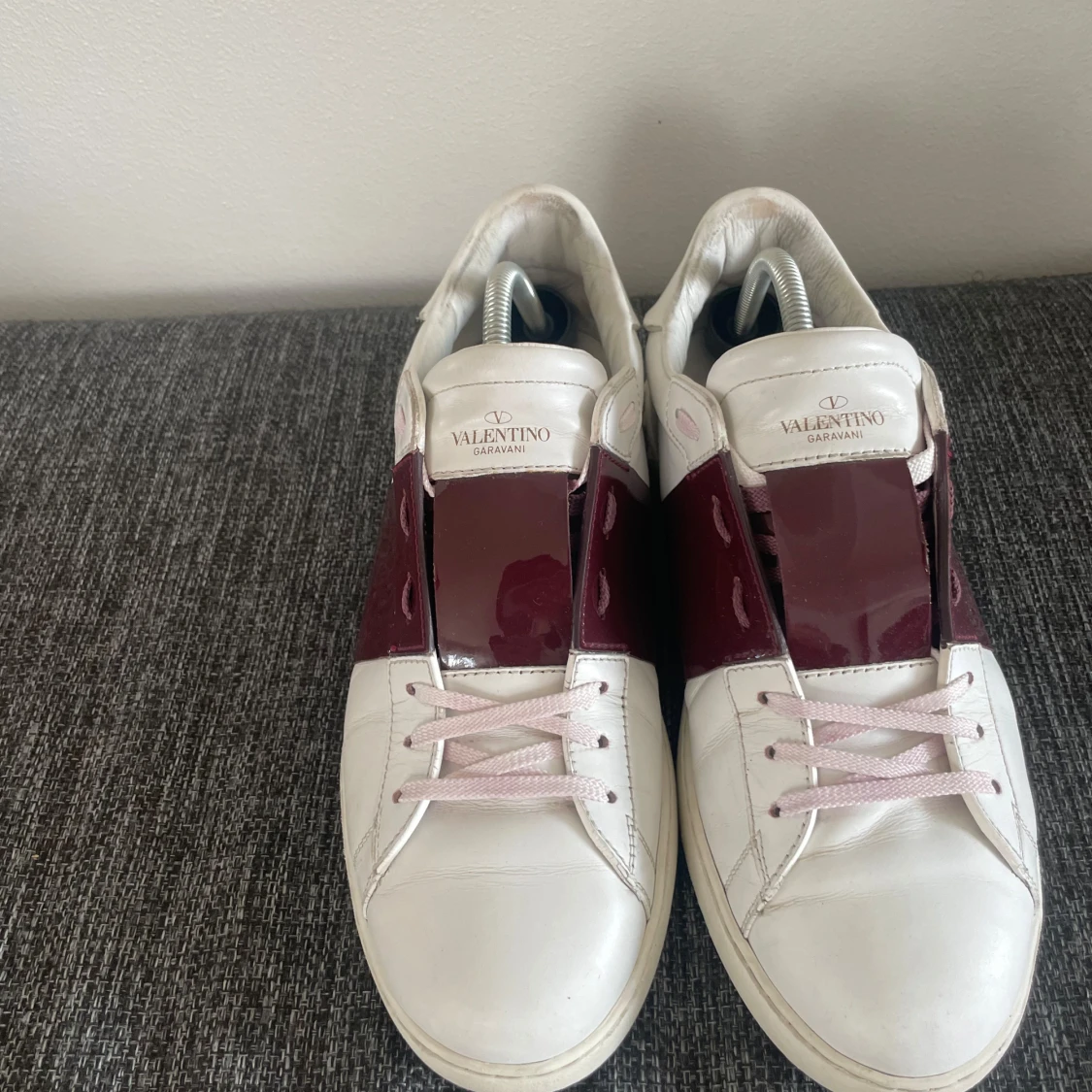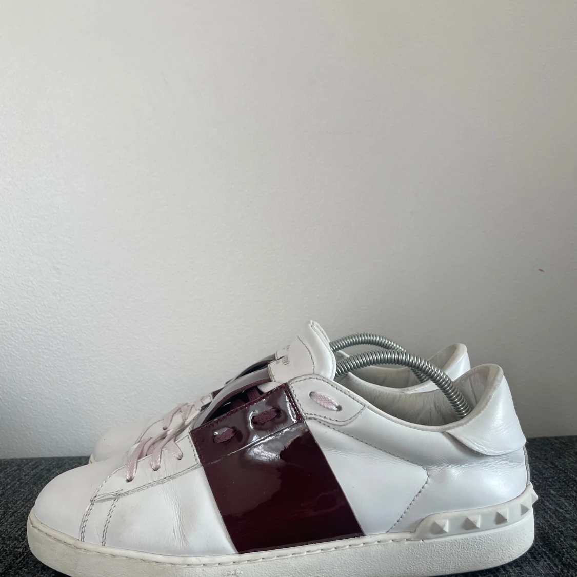 Snygga Valentino sneakers i vitt skinn med glansiga vinröda detaljer. Skorna har en unik design med snörning och en stilren look. Perfekta för att ge din outfit en lyxig touch.