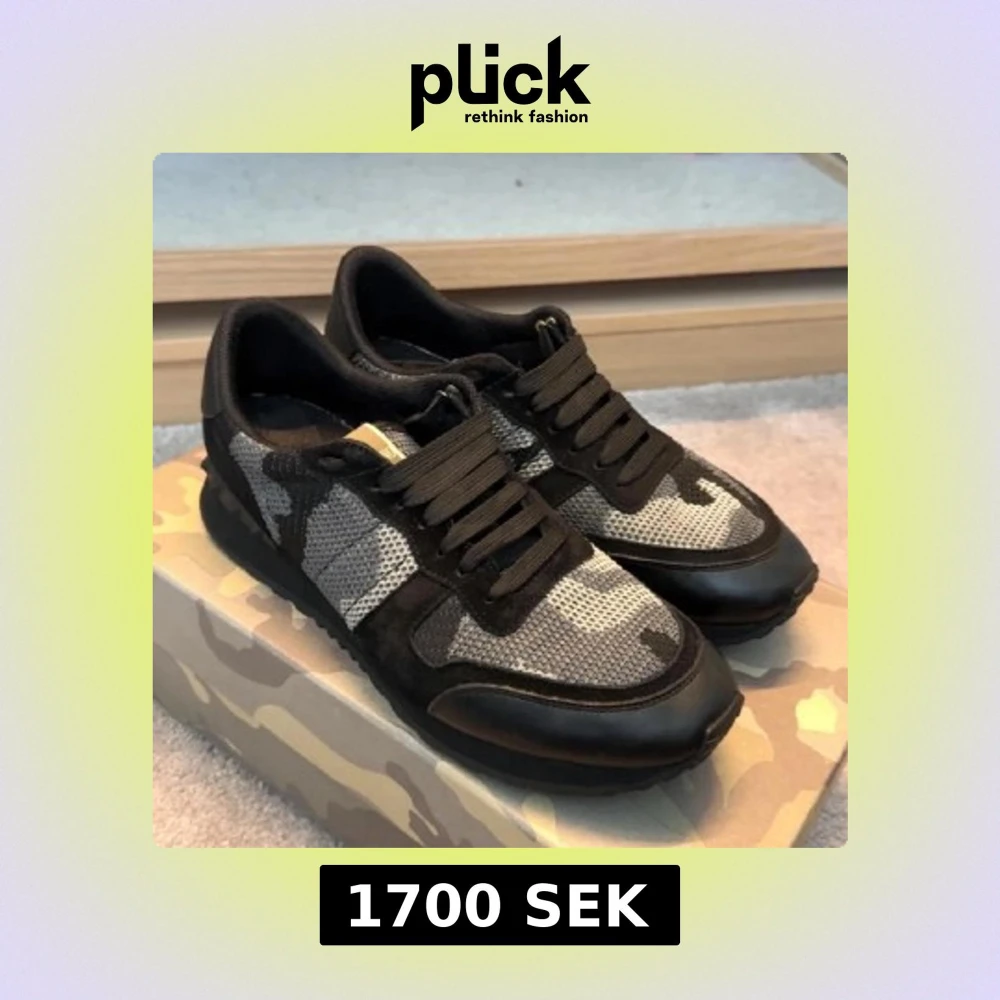 Snygga Valentino Rockrunner sneakers i svart och grått med camouflagemönster. Skorna har detaljer i mocka, mesh och skinn, samt svarta nitar på hälen. Klassisk snörning och platt sula. Perfekta för dig som vill sticka ut med en lyxig streetstyle.