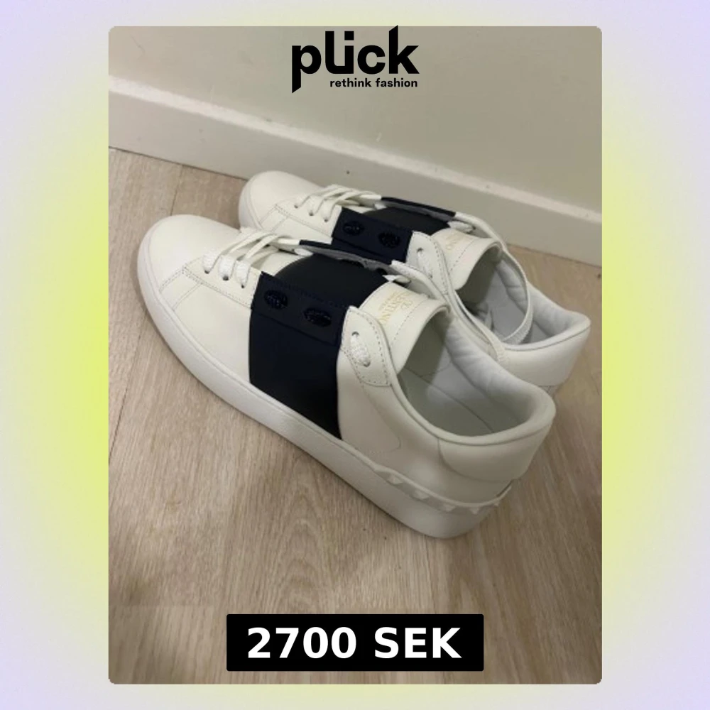 Snygga Valentino Garavani Open sneakers i vitt skinn med bred marinblå rem över snörningen. Platt sula och rund tå, samt ikoniska nitar baktill på hälen. Guldtext på tungan och vita skosnören. Perfekt för dig som gillar exklusiv streetstyle. Helt nya allt följer med paketet