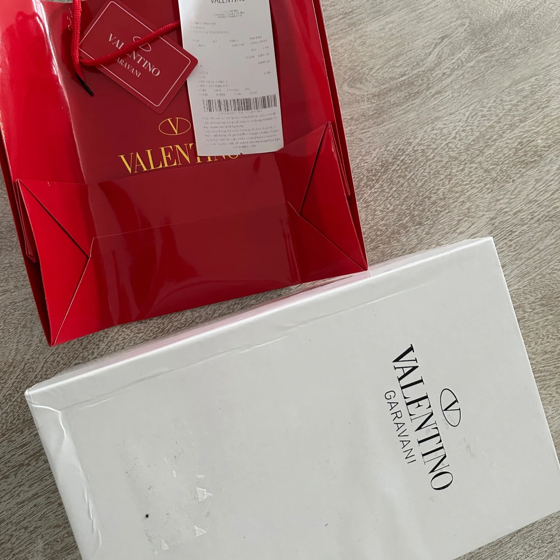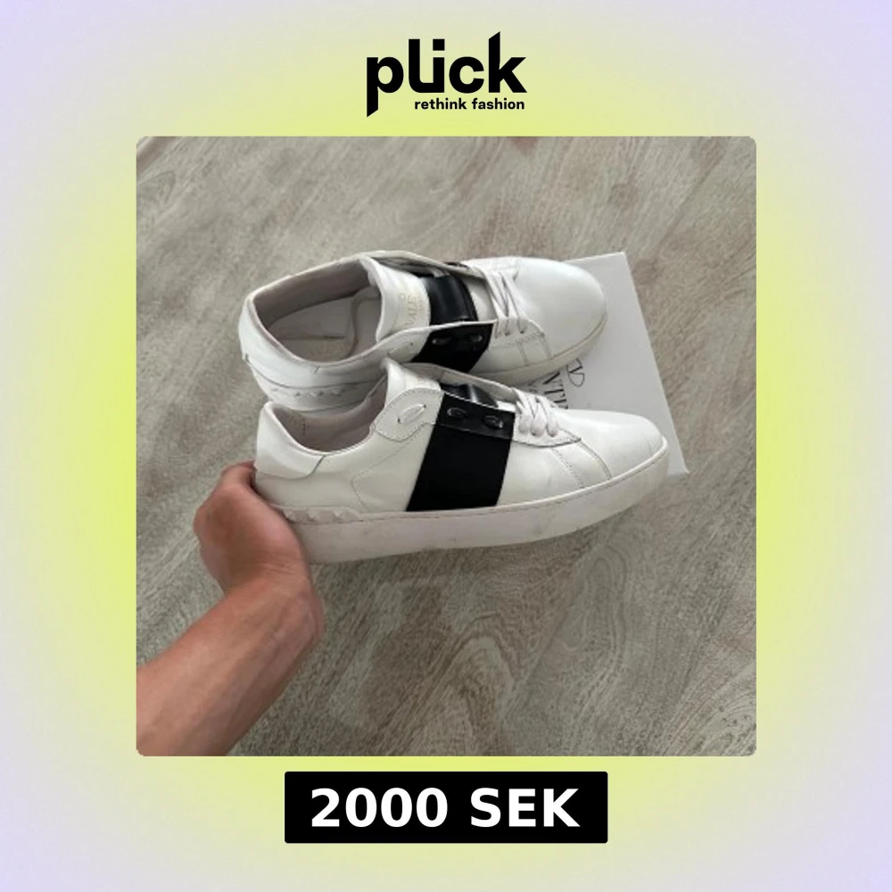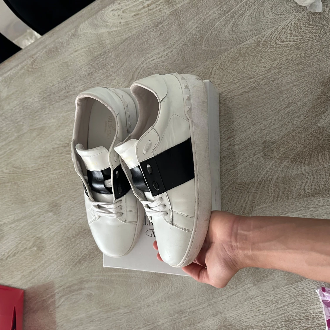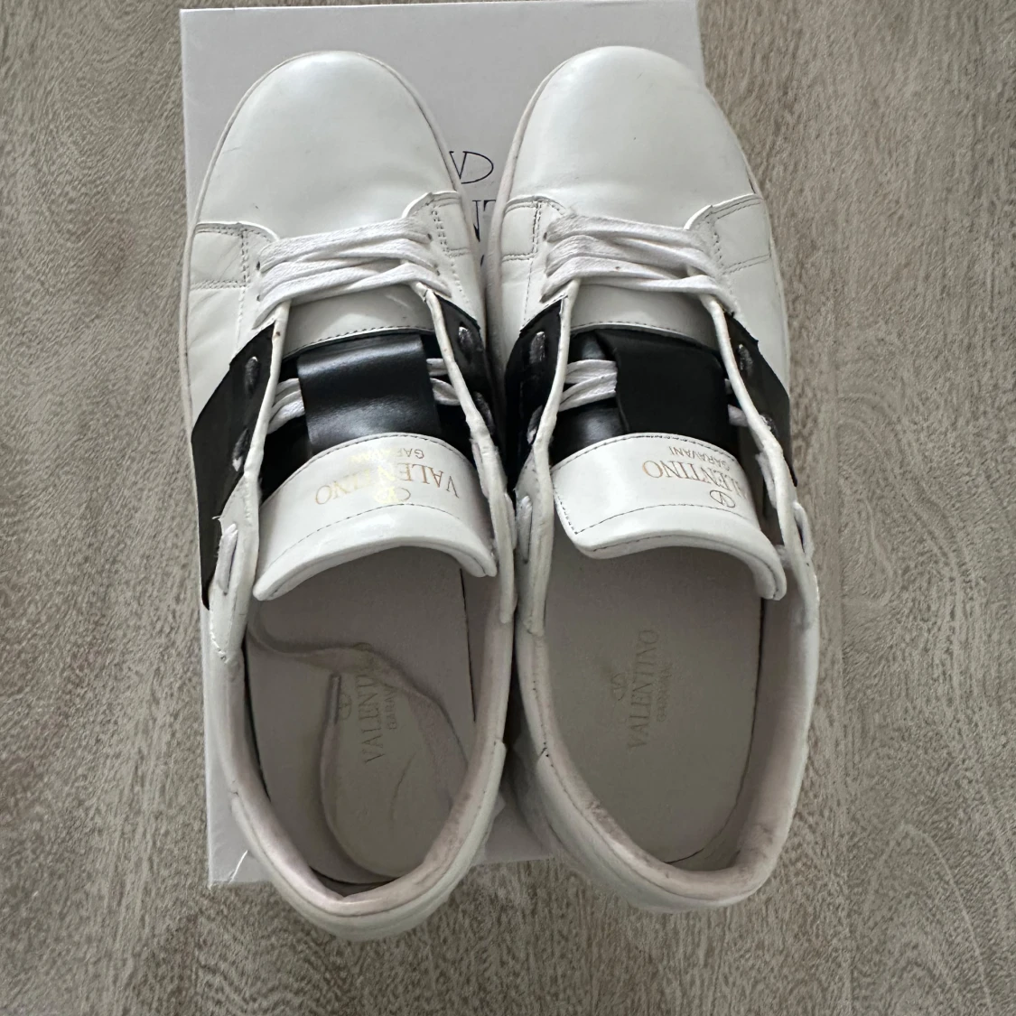 Snygga Valentino Garavani Open sneakers i vitt skinn med bred svart läderdetalj över vristen. Klassisk rund tå, vita snören och diskreta nitar på sulan. Perfekta för dig som gillar stilrena och lyxiga sneakers med en twist. Kvitto och allt finns med
