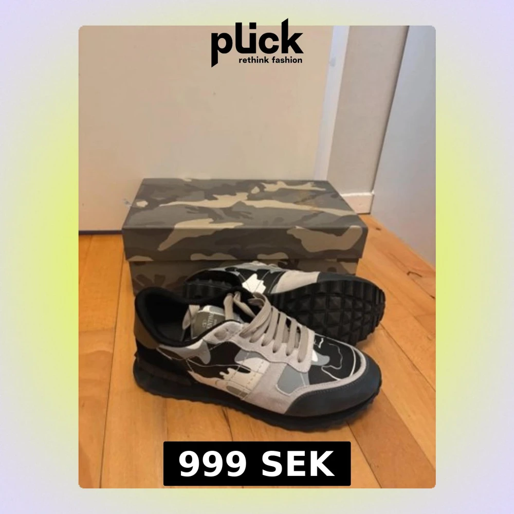Säljer ett par Valentino Garavani Rockrunner sneakers med grå, svart och vit camouflage-mönster. Skorna har platt sula med grovt mönster, rund tå och snörning. Materialmix av mocka och skinn ger en lyxig vibe. Box med matchande camo medföljer.