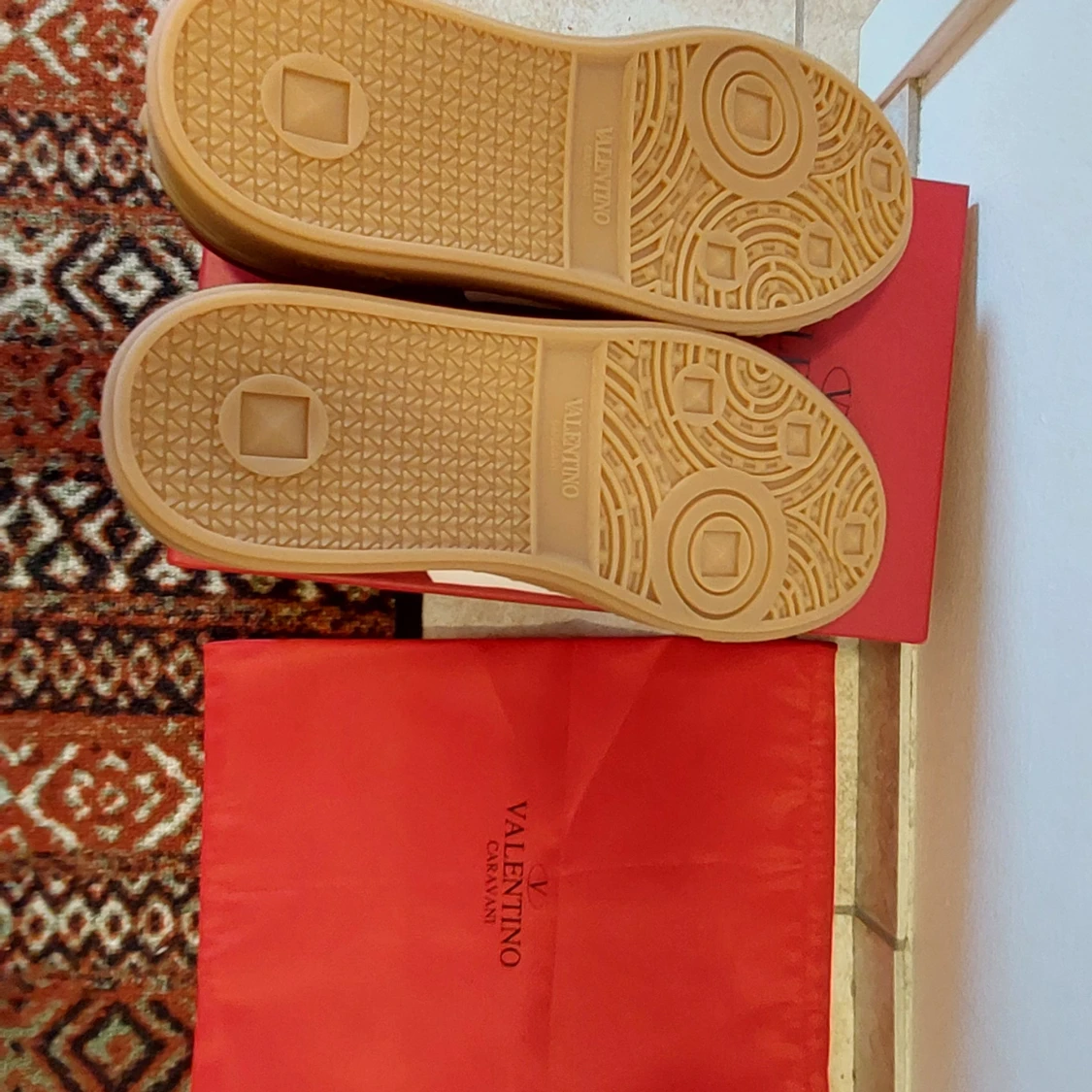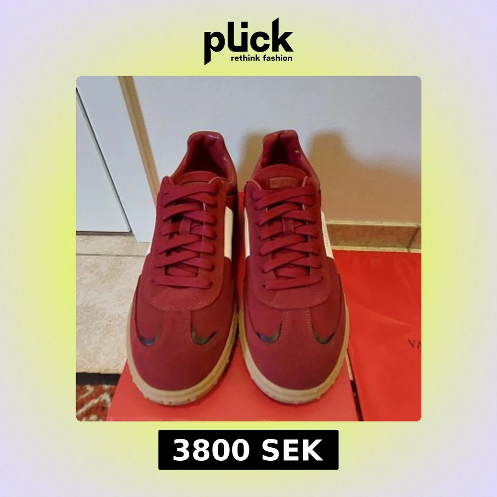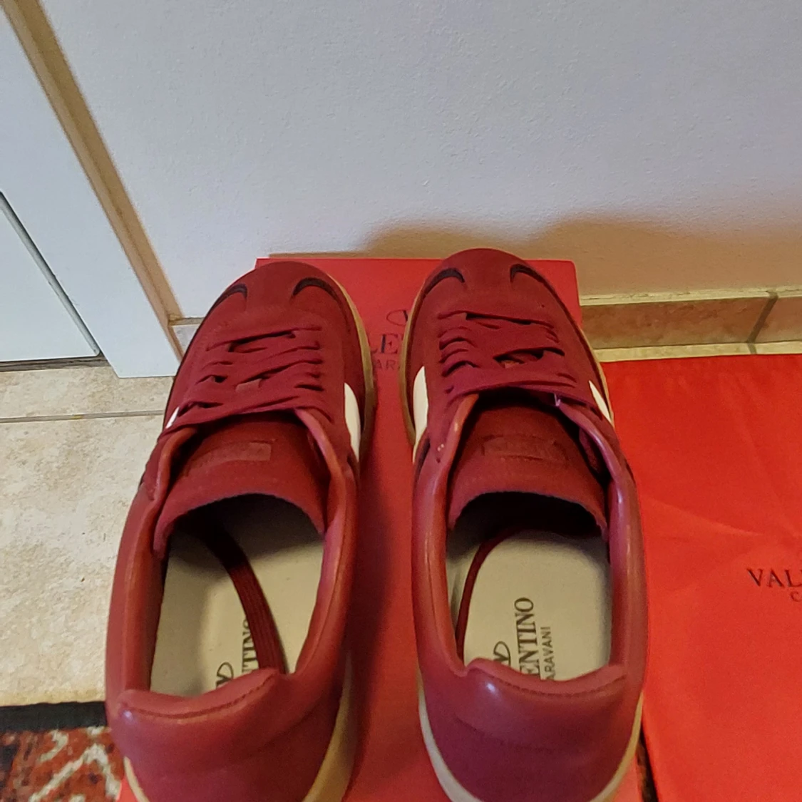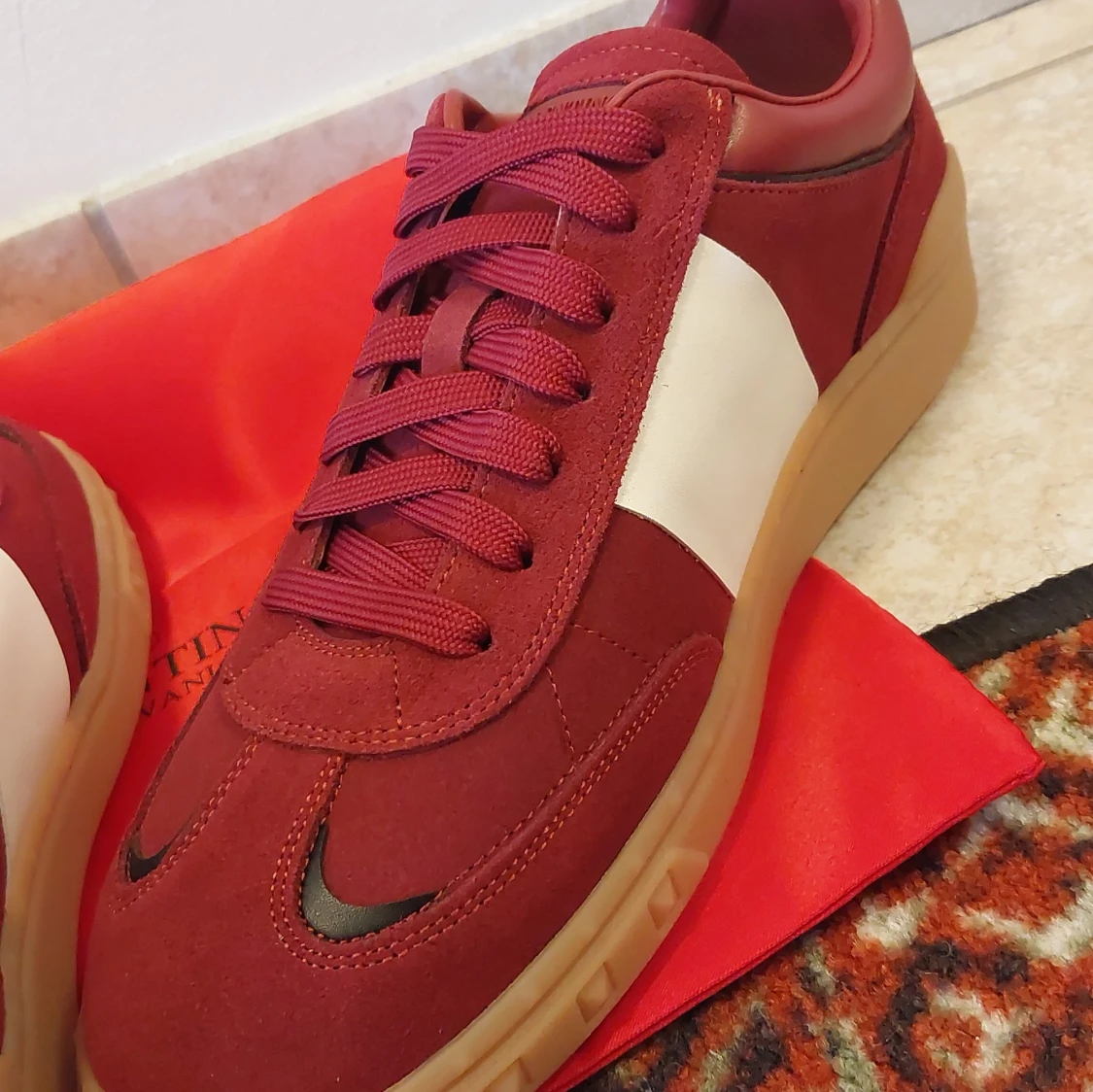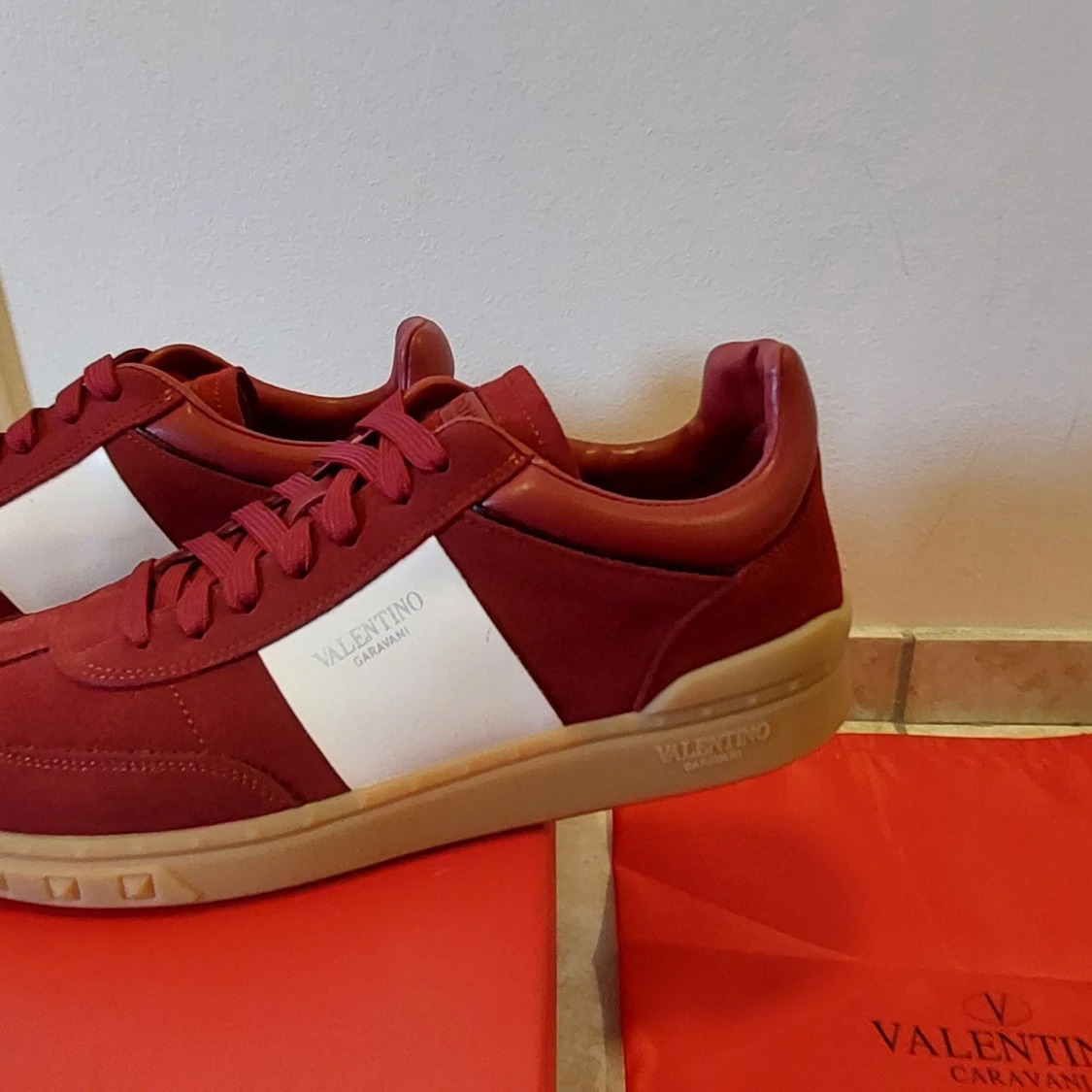 Snygga röda Valentino Garavani sneakers med vita sidopaneler och beige sula. Skorna har klassisk snörning, rund tå och är tillverkade i en mix av skinn och textil. Perfekta för dig som vill sticka ut med stilrena och exklusiva sneakers.