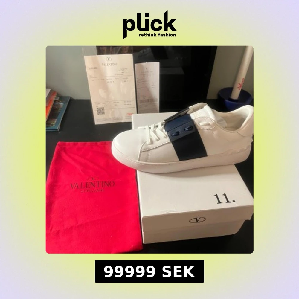 Säljer ett par vita Valentino Garavani Open sneakers med bred blå läderdetalj över mitten. Skorna har snörning, rund tå och platt sula. Klassisk och stilren design med diskret Valentino-logga på plösen. Aldrig använda. Helst byten mot andra skor i 45. Skriv gärna om du har nån fråga⭐️