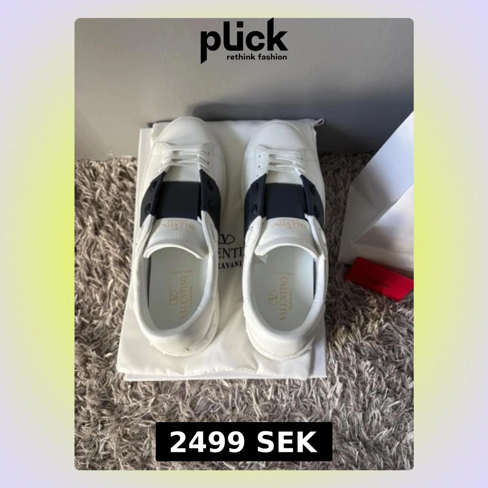 Snygga vita Valentino Garavani sneakers med svart detalj över snörningen. Klassisk rund tå, platt sula och diskret logga på insidan. Tillverkade i skinn och har en stilren, lyxig vibe. Perfekta för dig som vill ha något exklusivt men ändå cleant.