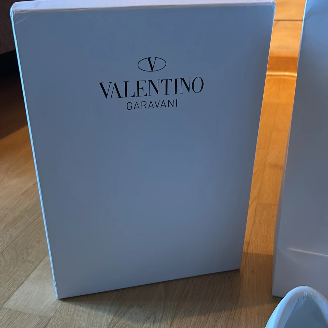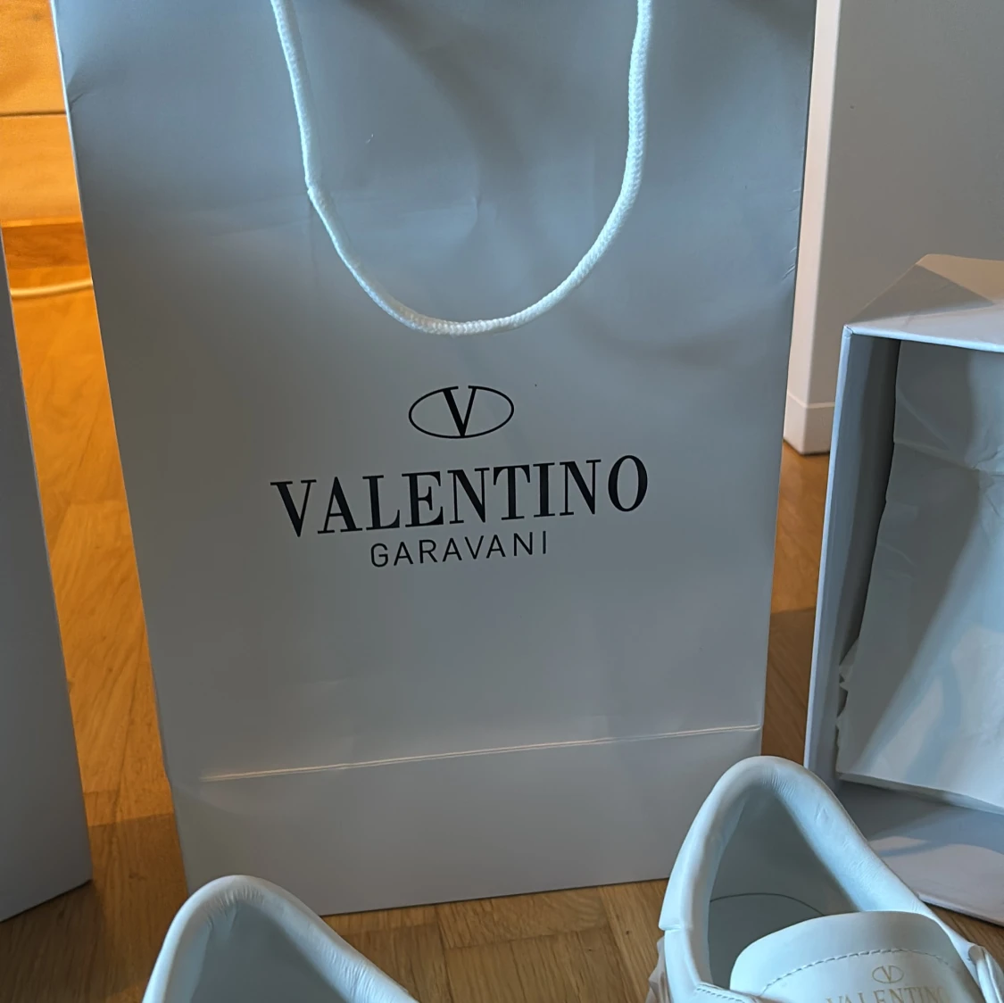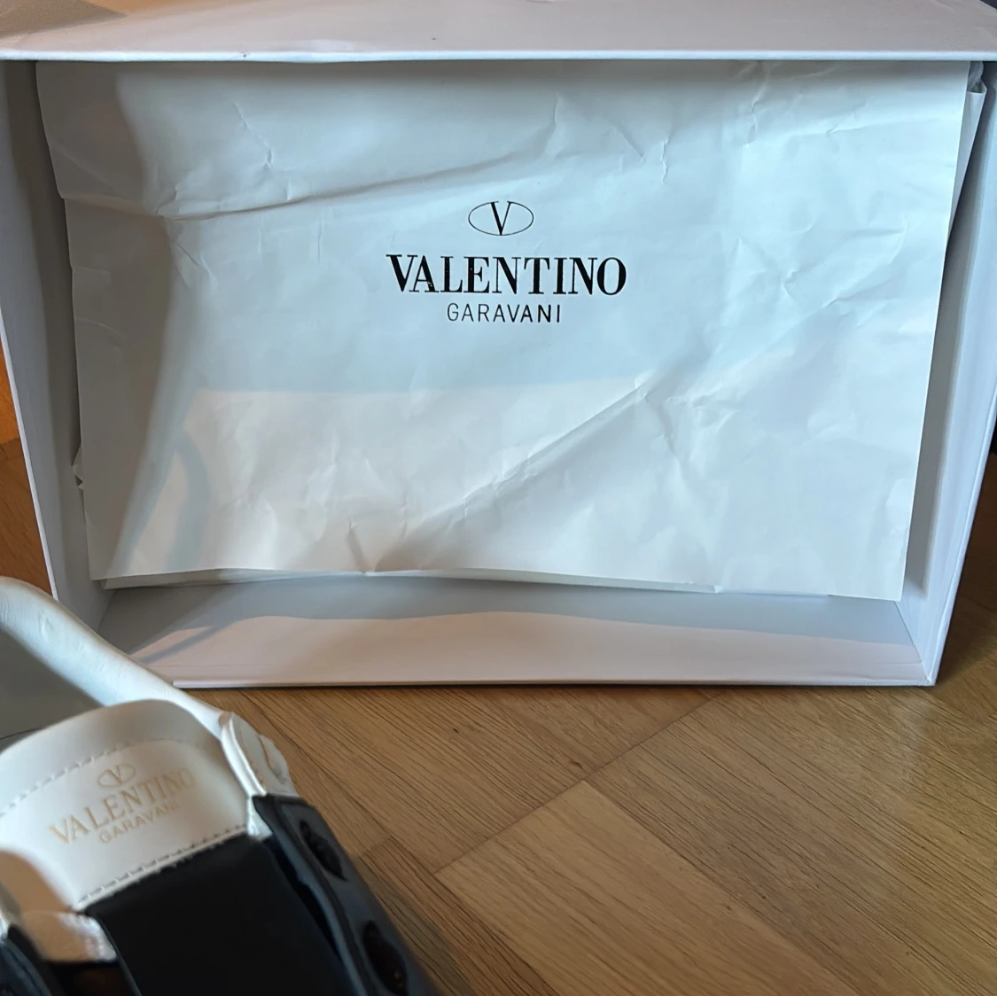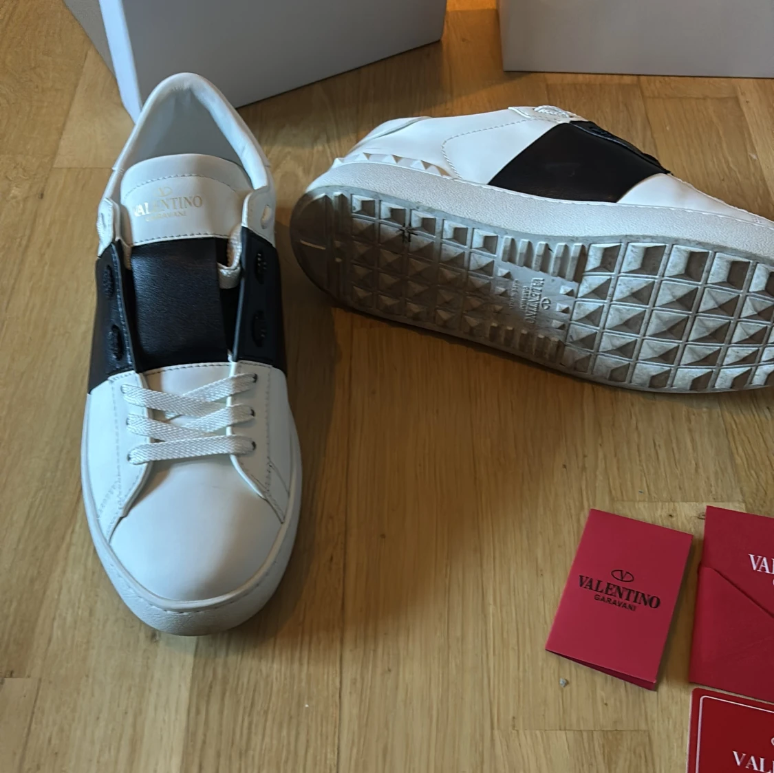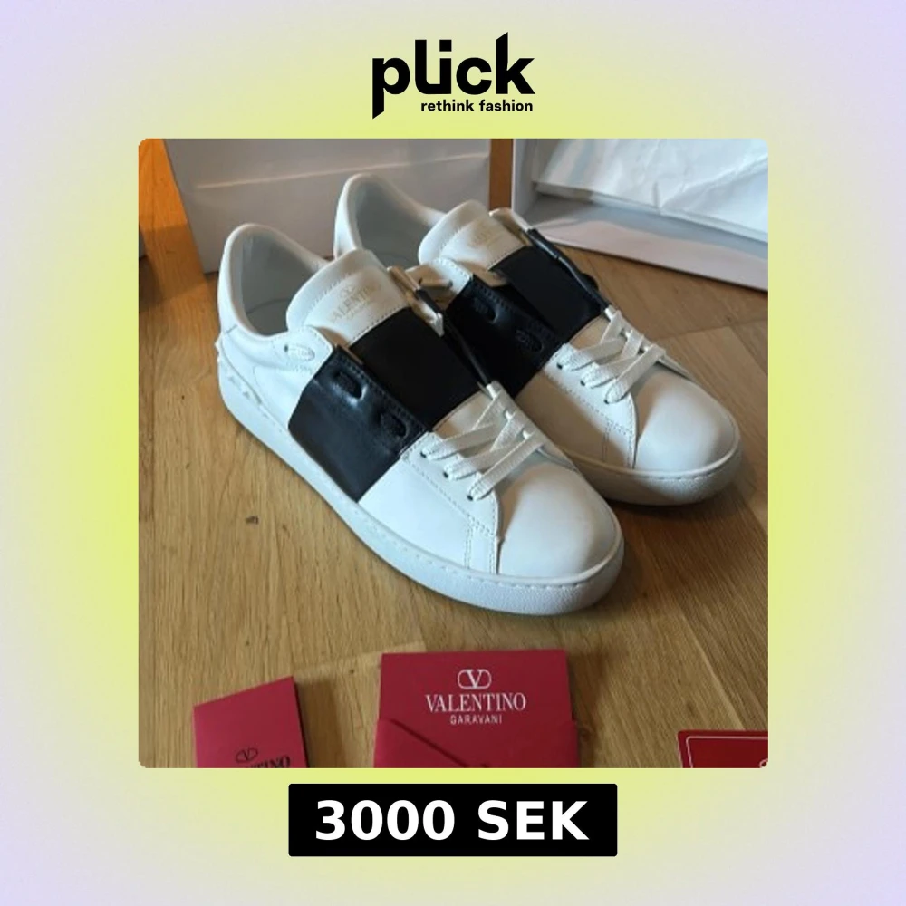 Säljer ett par Valentino Garavani Open sneakers i vit skinn med bred svart läderdetalj över mitten. Klassisk rund tå, platt sula och vita snören. Märkeslogga på plösen och insidan. Kommer med originalkartong och dustbag.