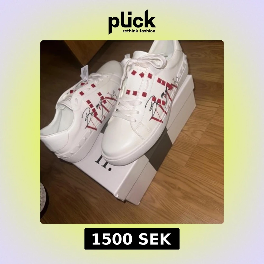 ALDRIG ANVÄNDA! Snygga vita Valentino Garavani sneakers i skinn med röda nitar och grafiskt tryck på sidorna. Skorna har snörning, platt sula och coola detaljer som ger en unik look. Perfekta för dig som vill sticka ut med exklusiva sneakers.