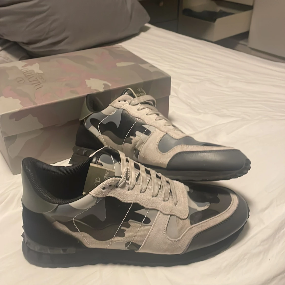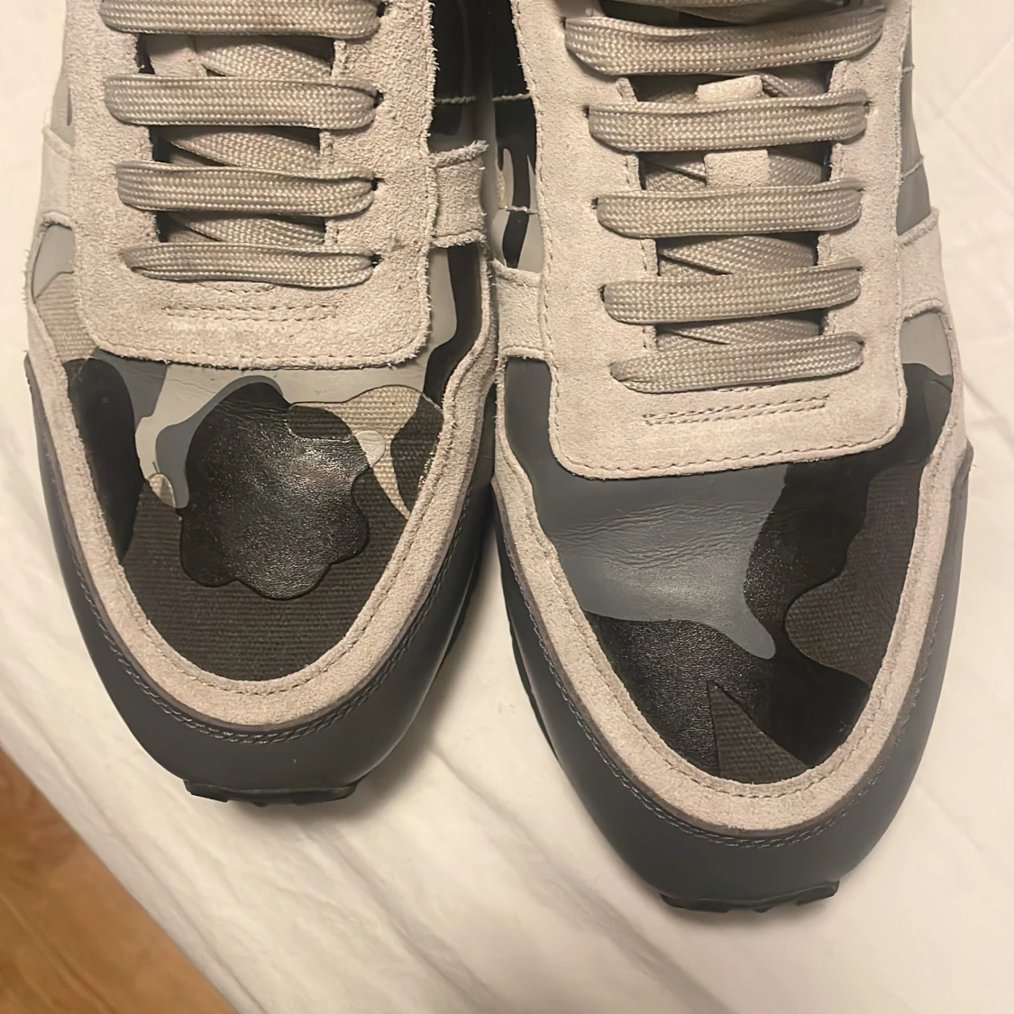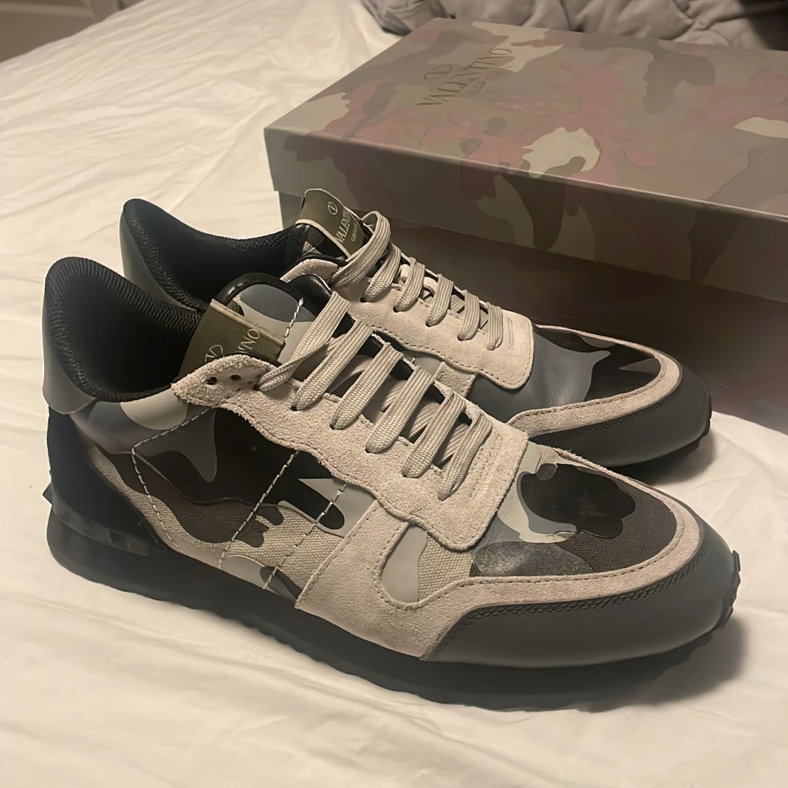 Snygga Valentino Garavani Rockrunner sneakers med grått och svart camouflagemönster. Skorna har detaljer i mocka och skinn, samt klassisk snörning. Sulan är svart och designen är riktigt clean och modern. Perfekta för vintern!
