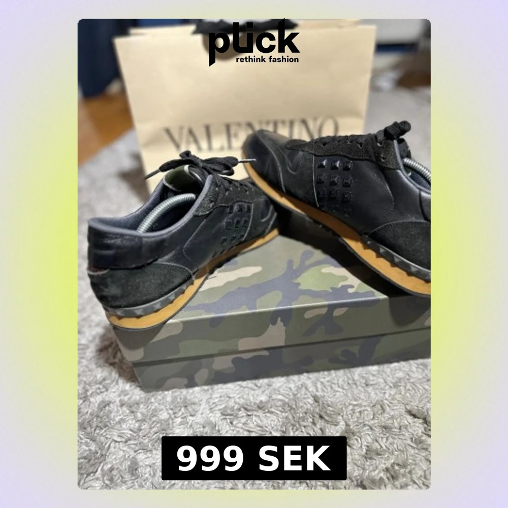 Svarta Valentino Rockrunner sneakers i skinn och mocka med coola nitar på sidorna. Skorna har svarta snören, gummisula i kontrasterande beige och detaljer i grått. Snygg och edgy design som sticker ut, perfekt för dig som gillar streetstyle med lyxig touch. Box ingår inte men kan skicka med vid förhandling. Äldre modell därav det billiga priset