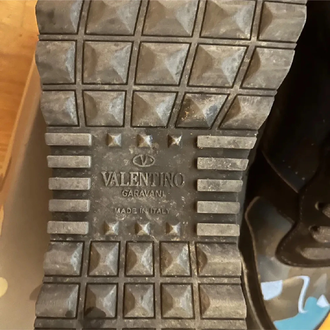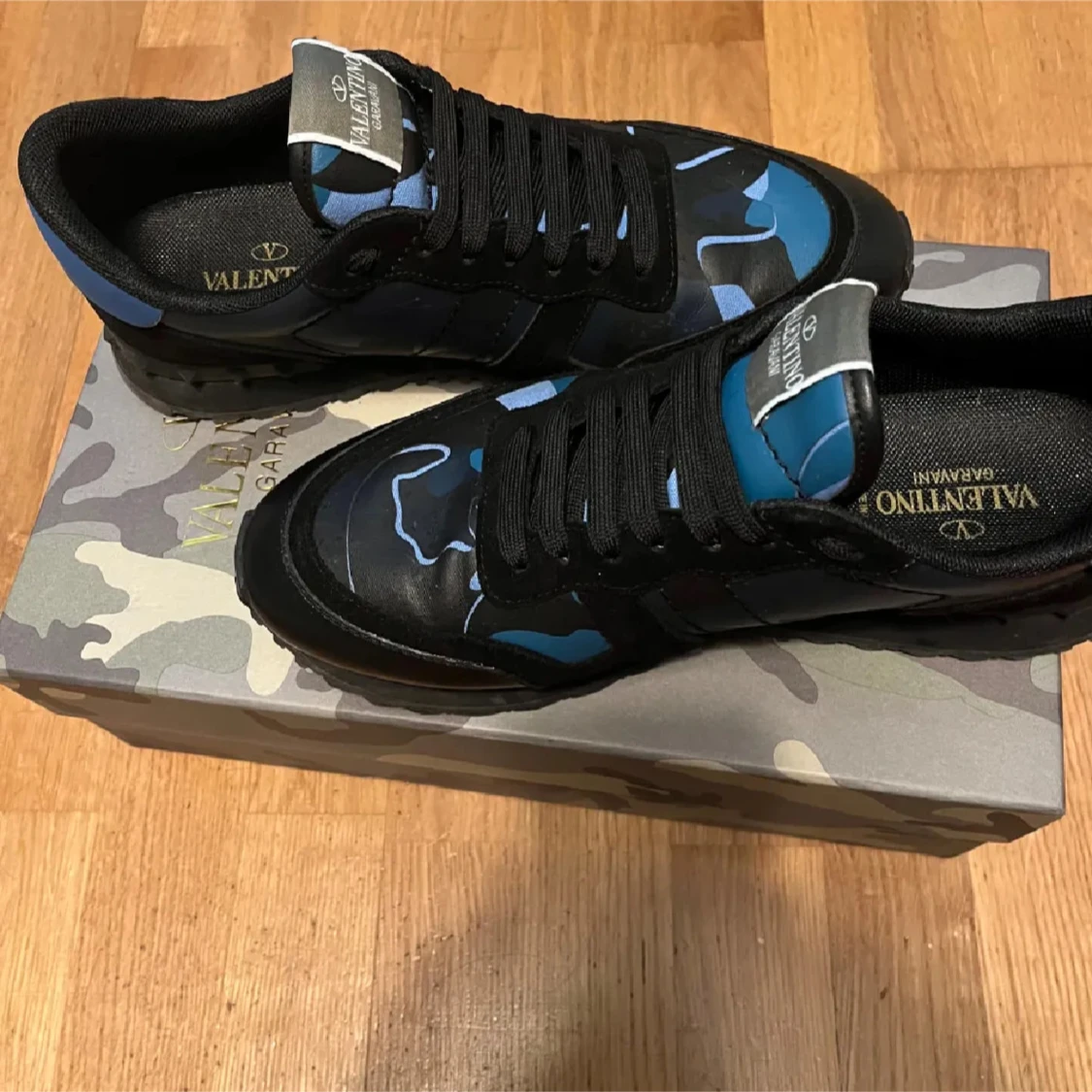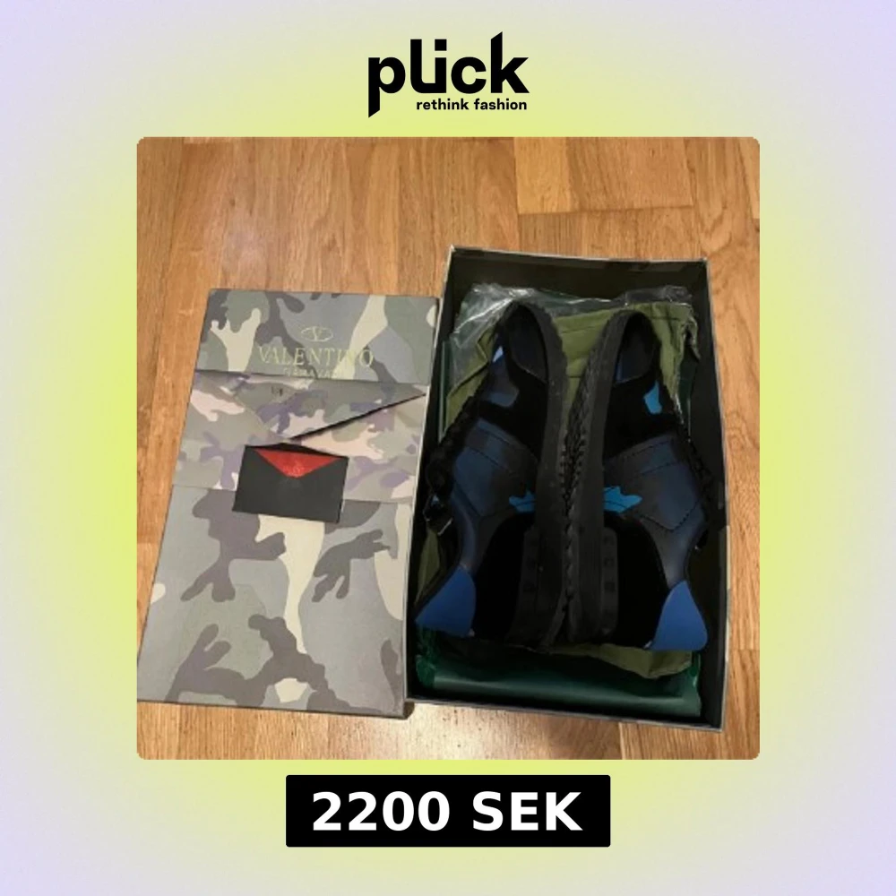 Snygga Valentino Garavani Rockrunner sneakers i svart och blått med coolt kamouflagemönster. Skorna har snörning, platt sula med nitar och detaljer i skinn och textil. Perfekta för dig som vill sticka ut med exklusiva och trendiga sneakers. Pris kan diskuteras