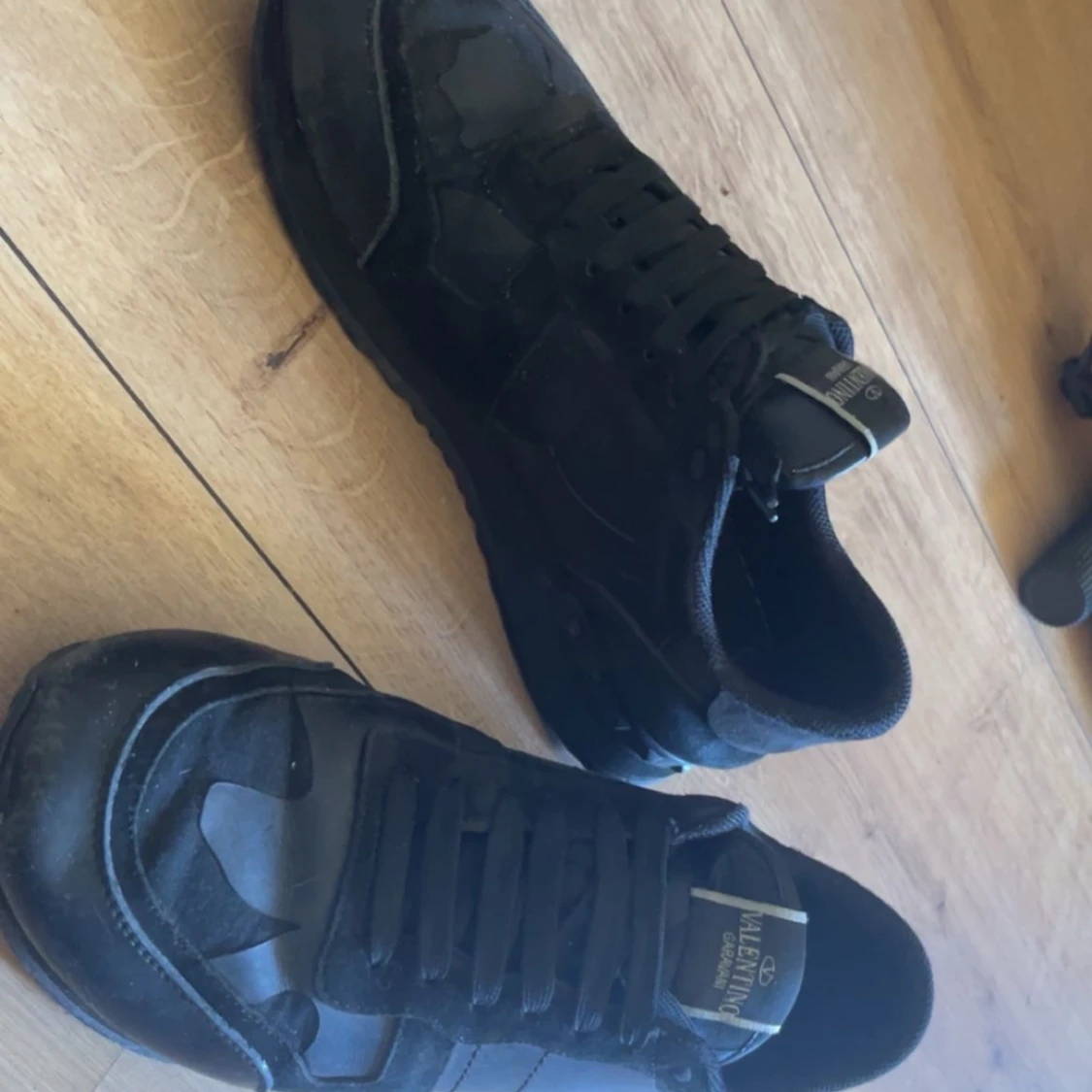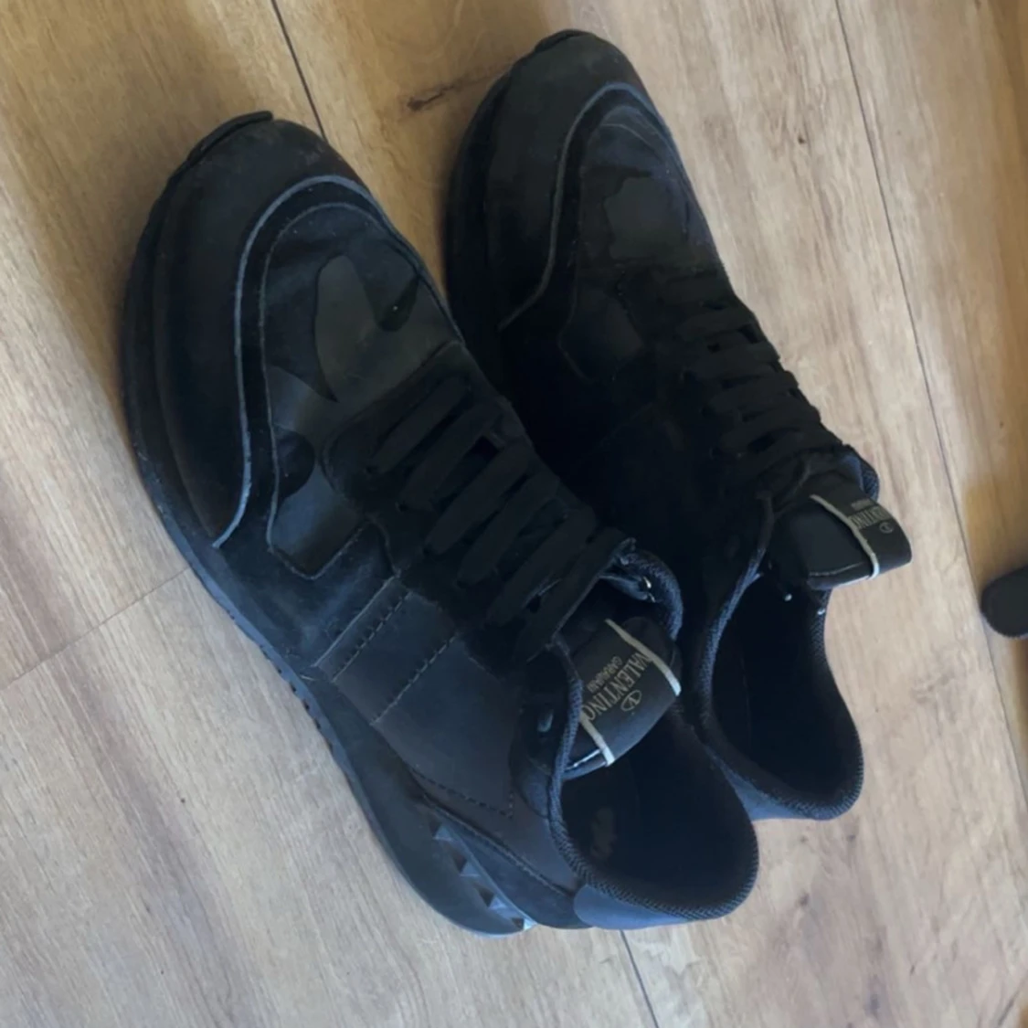 Säljer ett par svarta Valentino Rockrunner sneakers med kamouflagemönster och detaljer i mocka och skinn. Skorna har snörning och en platt sula med nitar på hälen. Perfekta för dig som gillar exklusiva och stilrena sneakers.