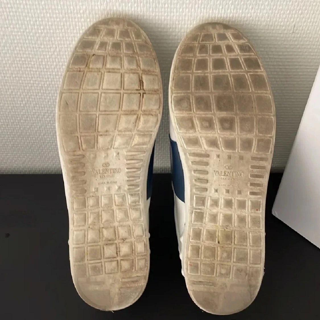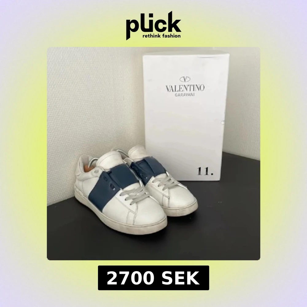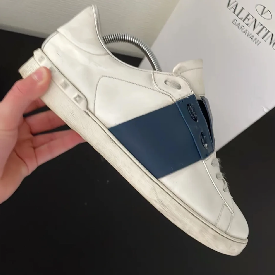 Snygga Valentino Garavani Open sneakers i vitt skinn med bred marinblå läderdetalj över snörningen. Klassisk rund tå, platt sula och diskret logga på plösen. Perfekta för dig som gillar lyxiga och stilrena sneakers med unik touch. Bra behandlade och väldigt bekväma. Priset inte hugget i sten.