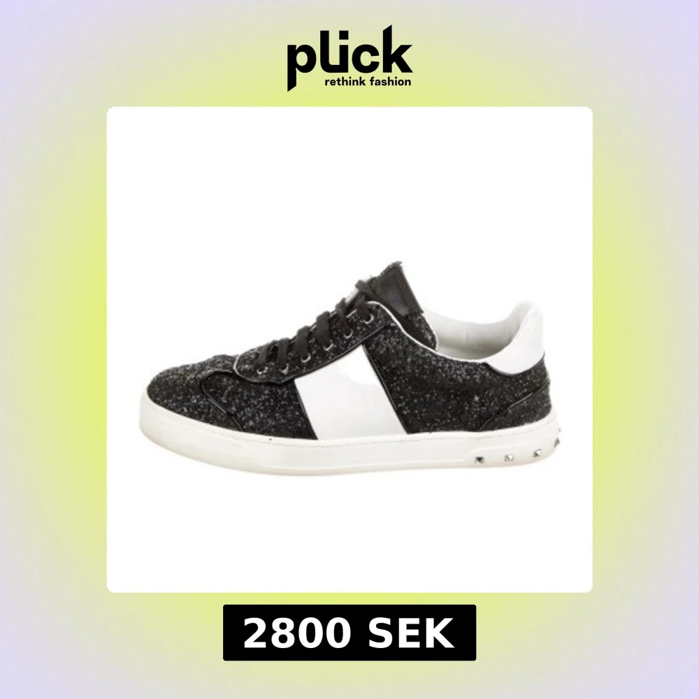 Säljer ett par snygga sneakers från Valentino i svart och vitt med glittrig ovandel och coola nitar på sulan. Skorna har snörning och en klassisk rund tå. Perfekta för dig som vill sticka ut med din stil.