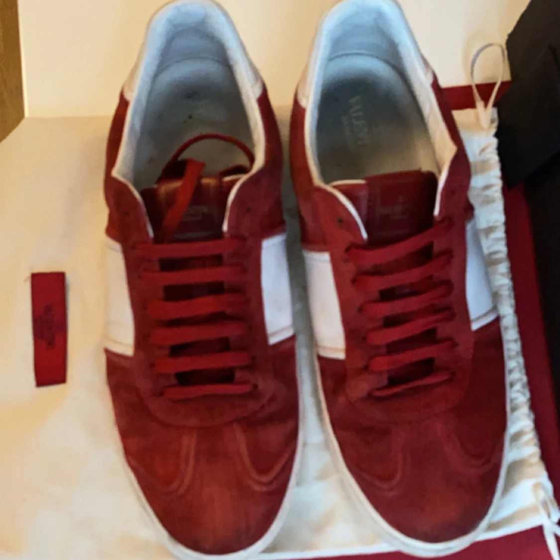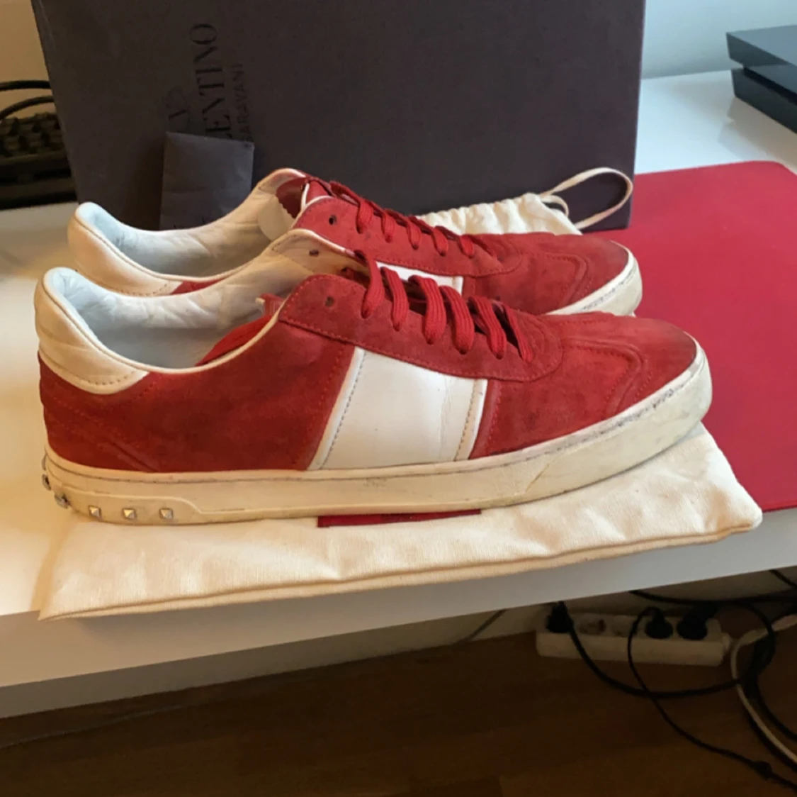 Säljer dom här feta röda valentino fly crews dom är i väldigt bra skick alla spikar dom är stolek 44 ny pris runt 7000 mitt pris 3200