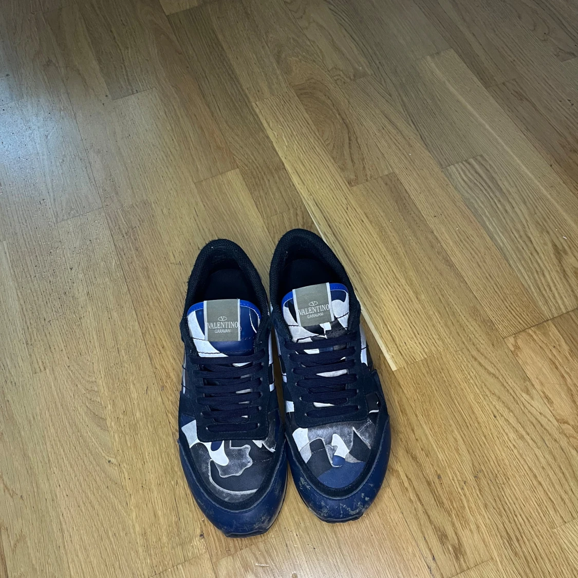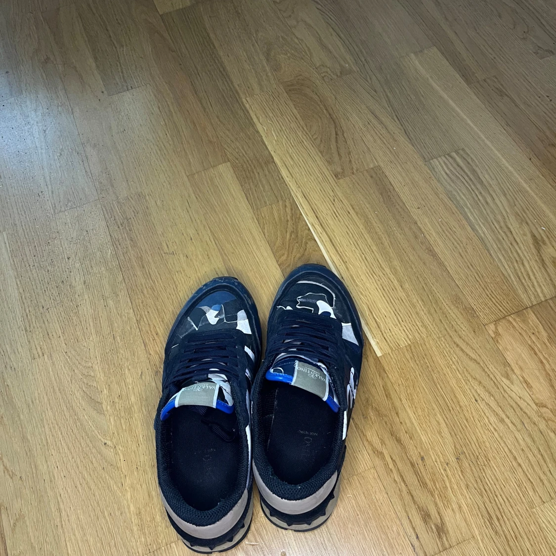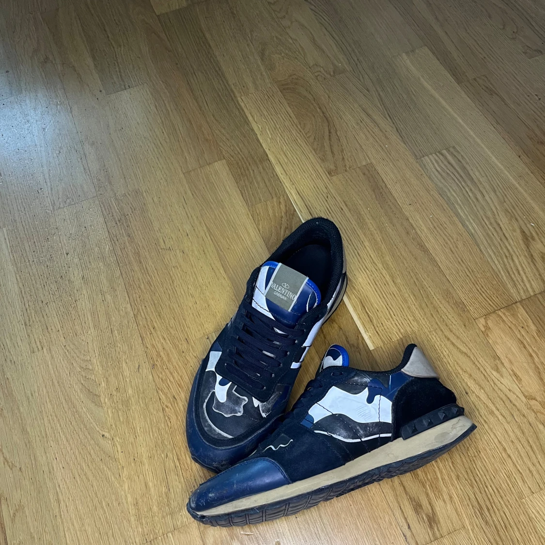 Snygga sneakers från Valentino Garavani med blå, svarta och grå camouflage-detaljer. Skorna har svarta snören, rund tå och coola kontraster i material som mocka och textil. Perfekta för dig som vill sticka ut med exklusiva och trendiga sneakers. Använda rockrunner dem är äkta dock har jag ut boxen till dem men pris kan diskuteras fraktar samma dag!