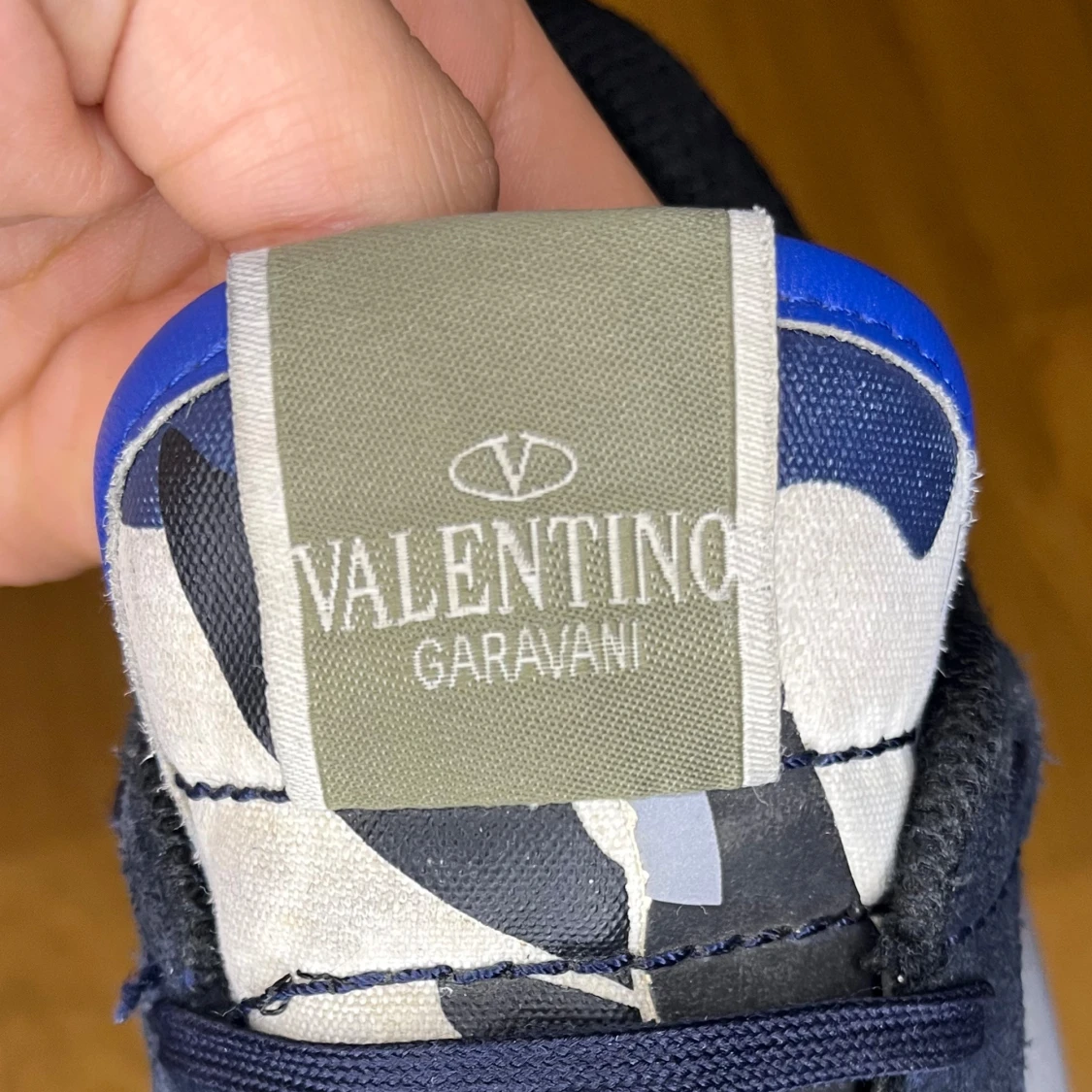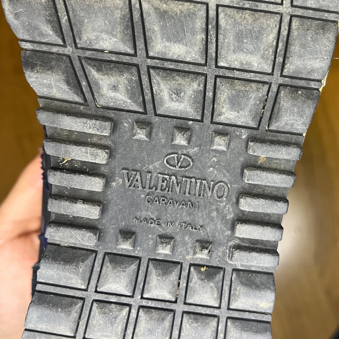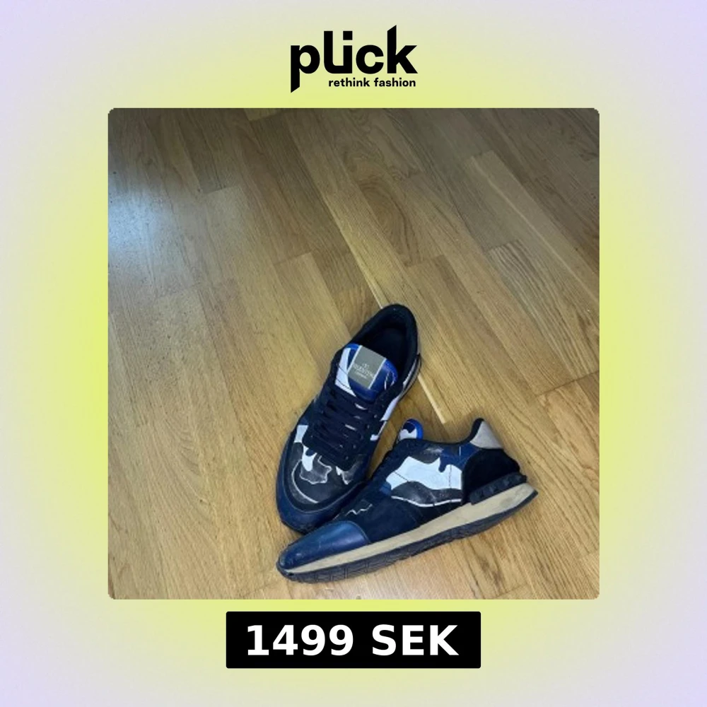 Snygga sneakers från Valentino Garavani med blå, svarta och grå camouflage-detaljer. Skorna har svarta snören, rund tå och coola kontraster i material som mocka och textil. Perfekta för dig som vill sticka ut med exklusiva och trendiga sneakers. Använda rockrunner dem är äkta dock har jag ut boxen till dem men pris kan diskuteras fraktar samma dag!