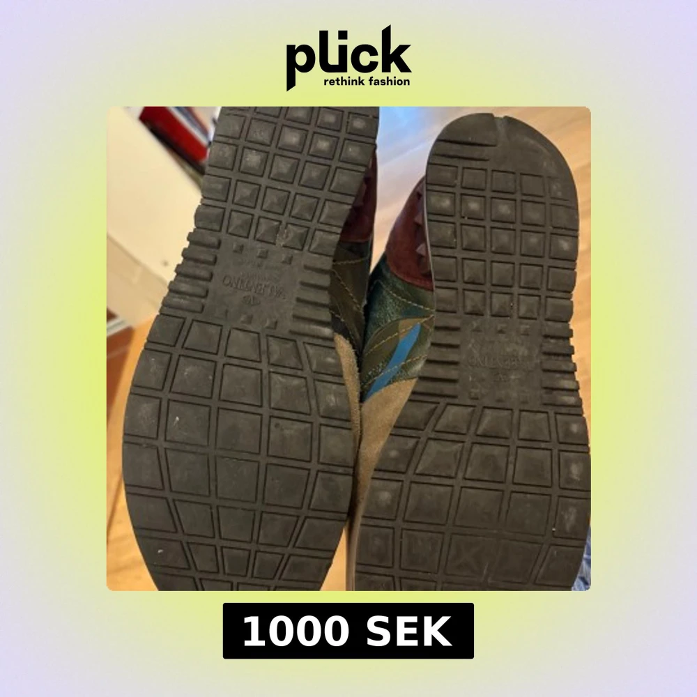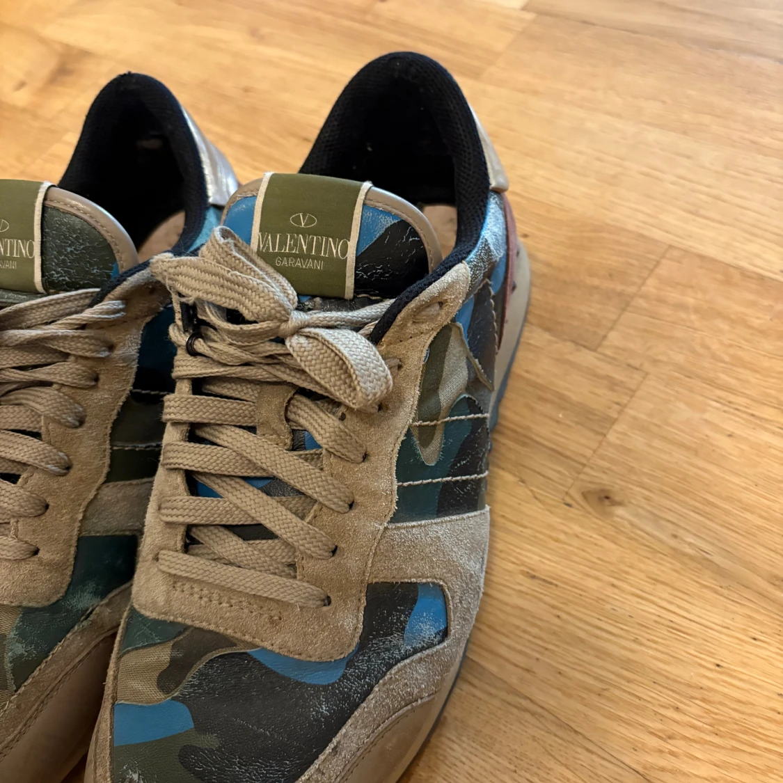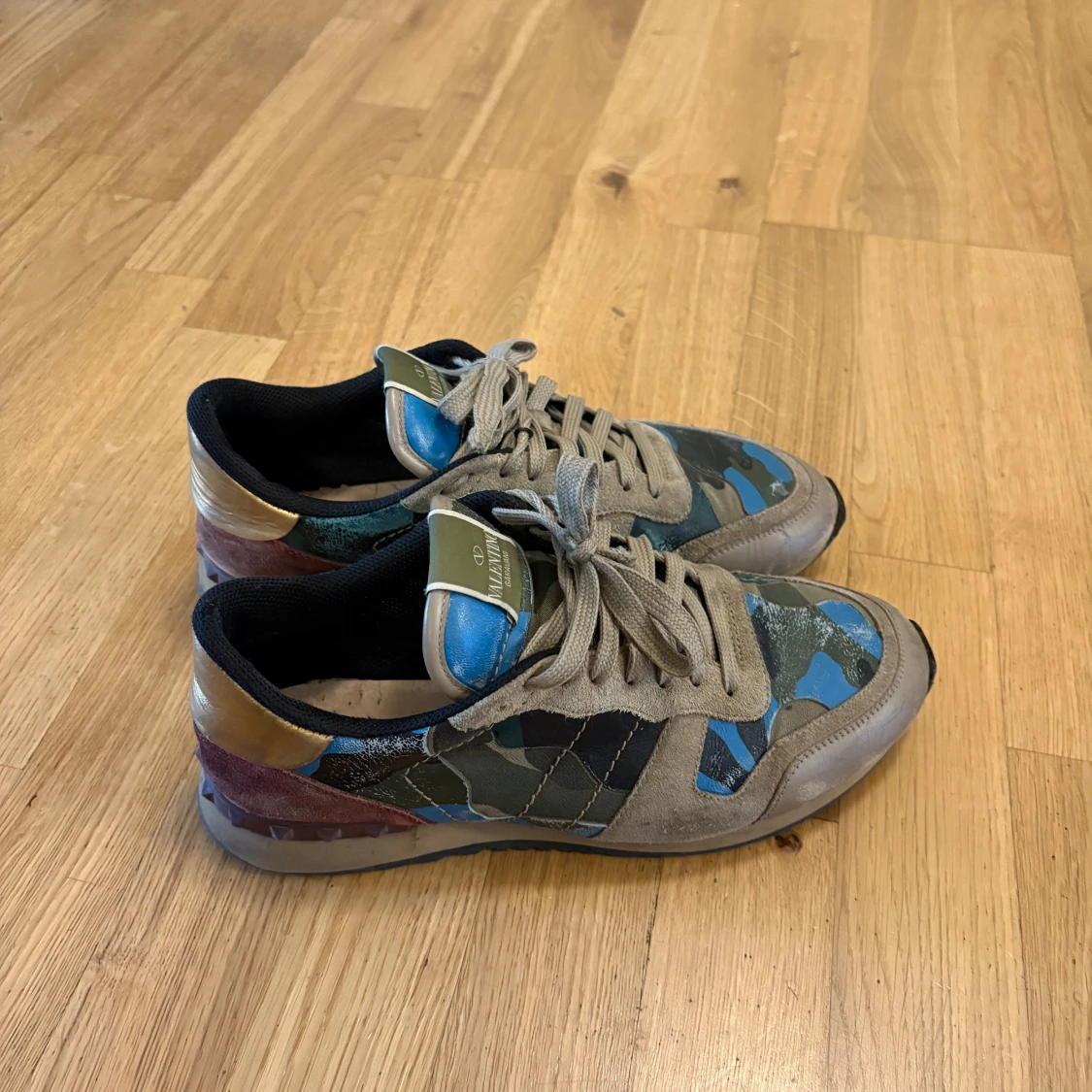 Snygga Valentino Garavani sneakers med camouflagemönster i blått, grönt och beige. Skorna har detaljer i mocka och skinn, samt coola guld- och vinröda partier vid hälen. Klassisk snörning och platt sula. Perfekta för dig som vill sticka ut med stil.