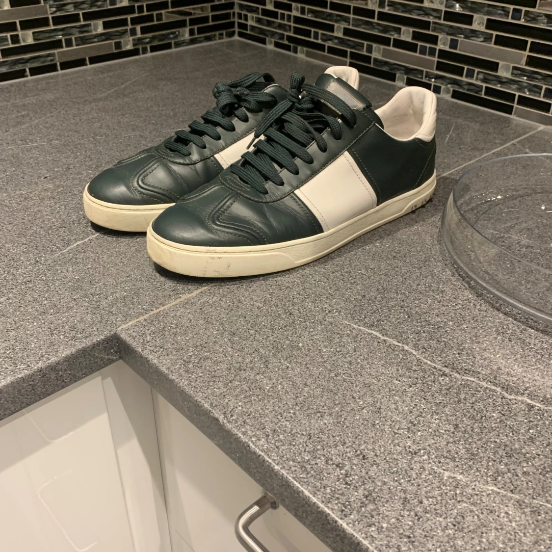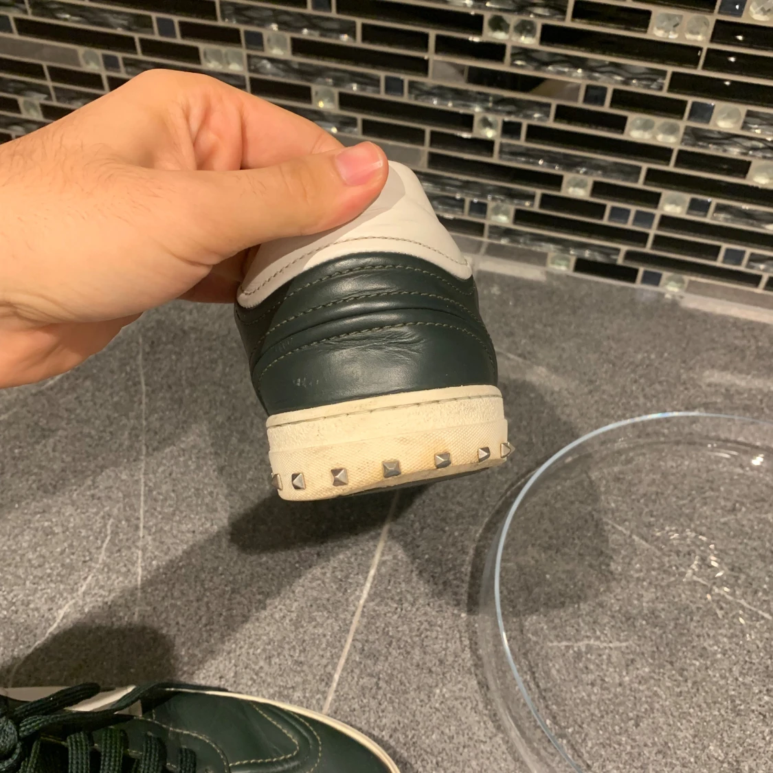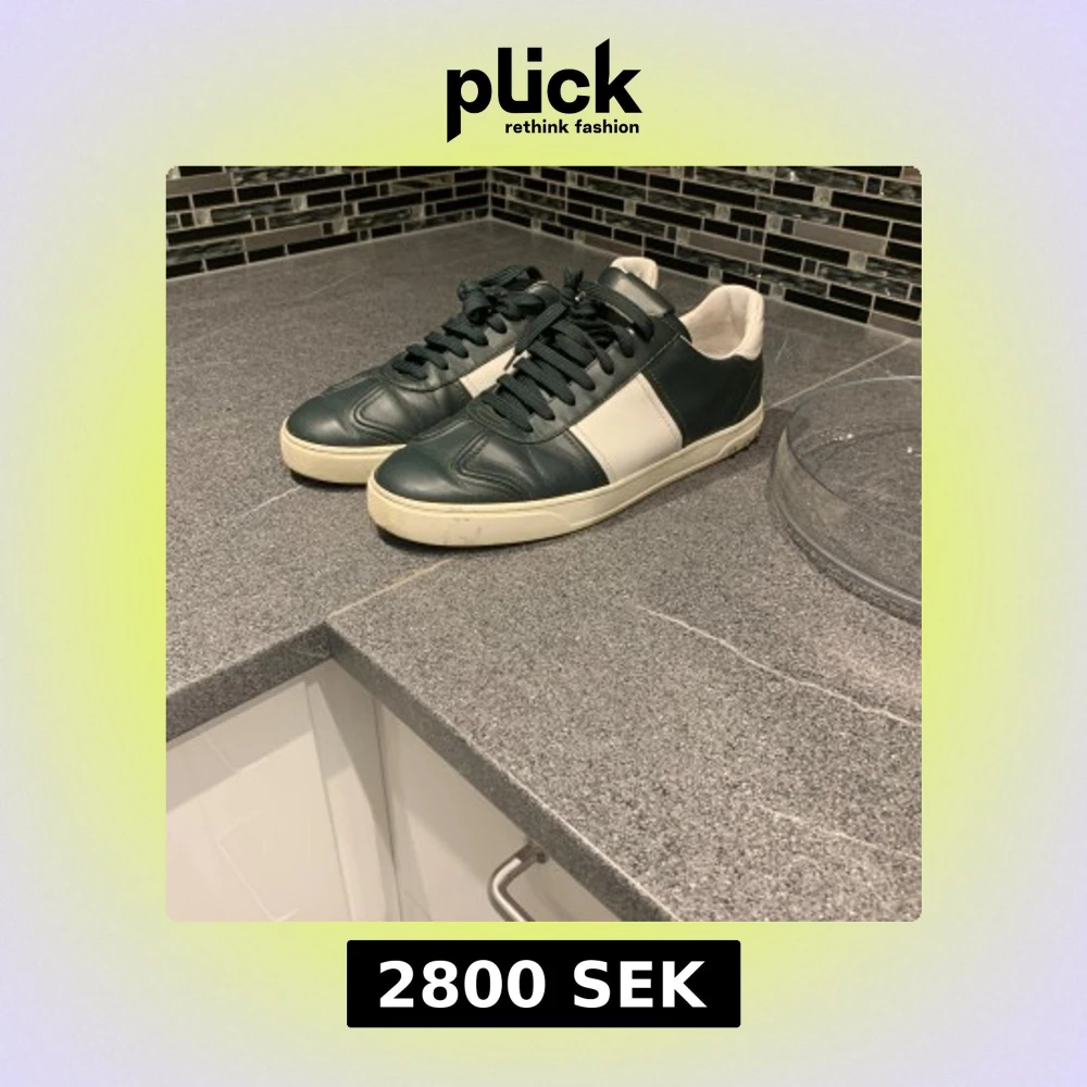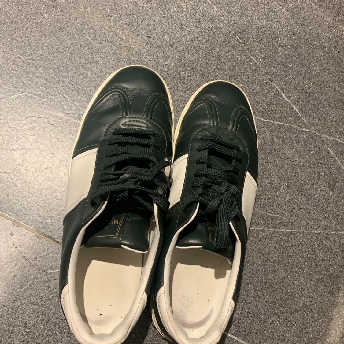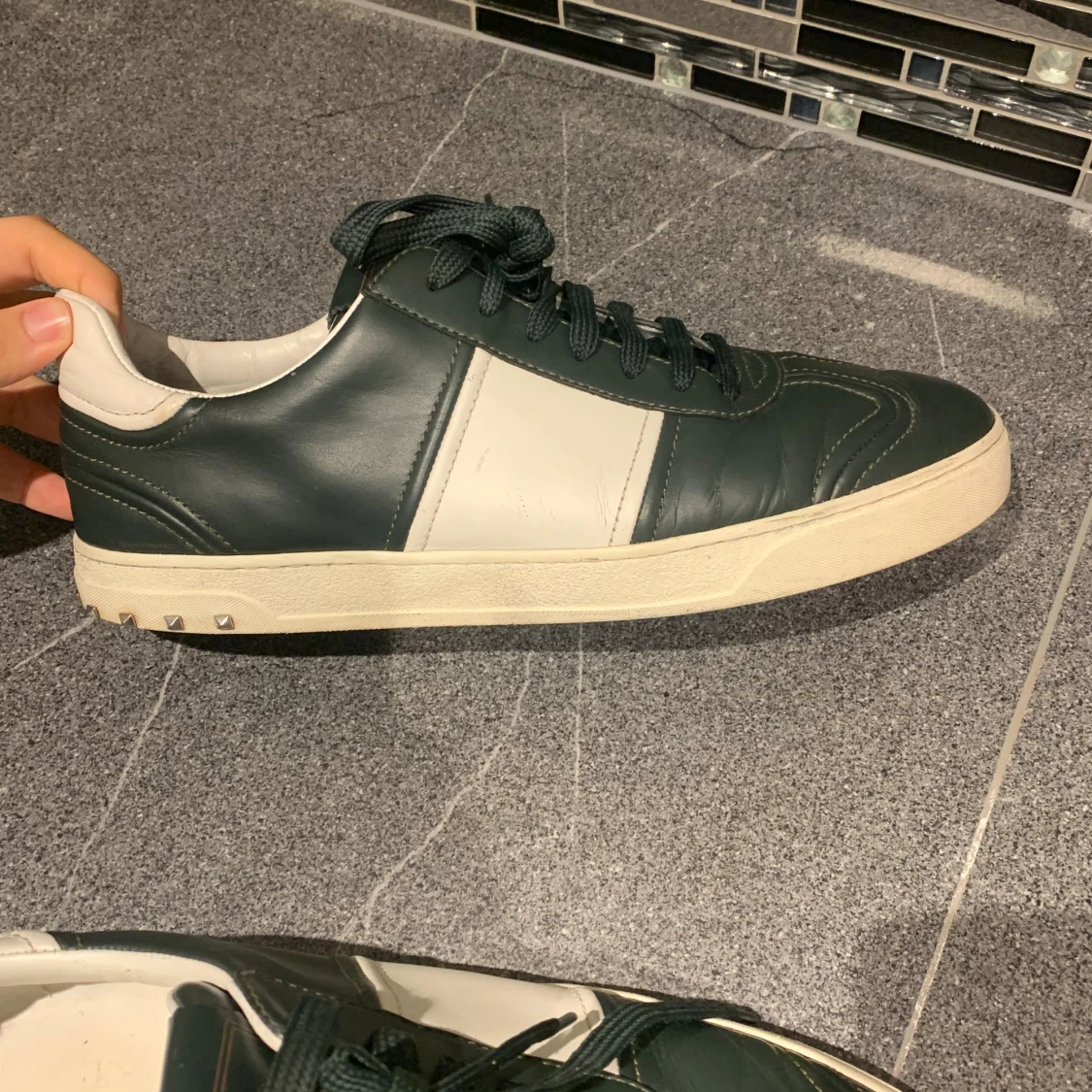 Snygga Valentino Garavani sneakers i mörkgrönt och vitt skinn med coola nitar på hälen. Klassisk låg modell med snörning och vit sula. Perfekta för dig som vill ha en stilren men ändå edgy look. Valentino flycrew