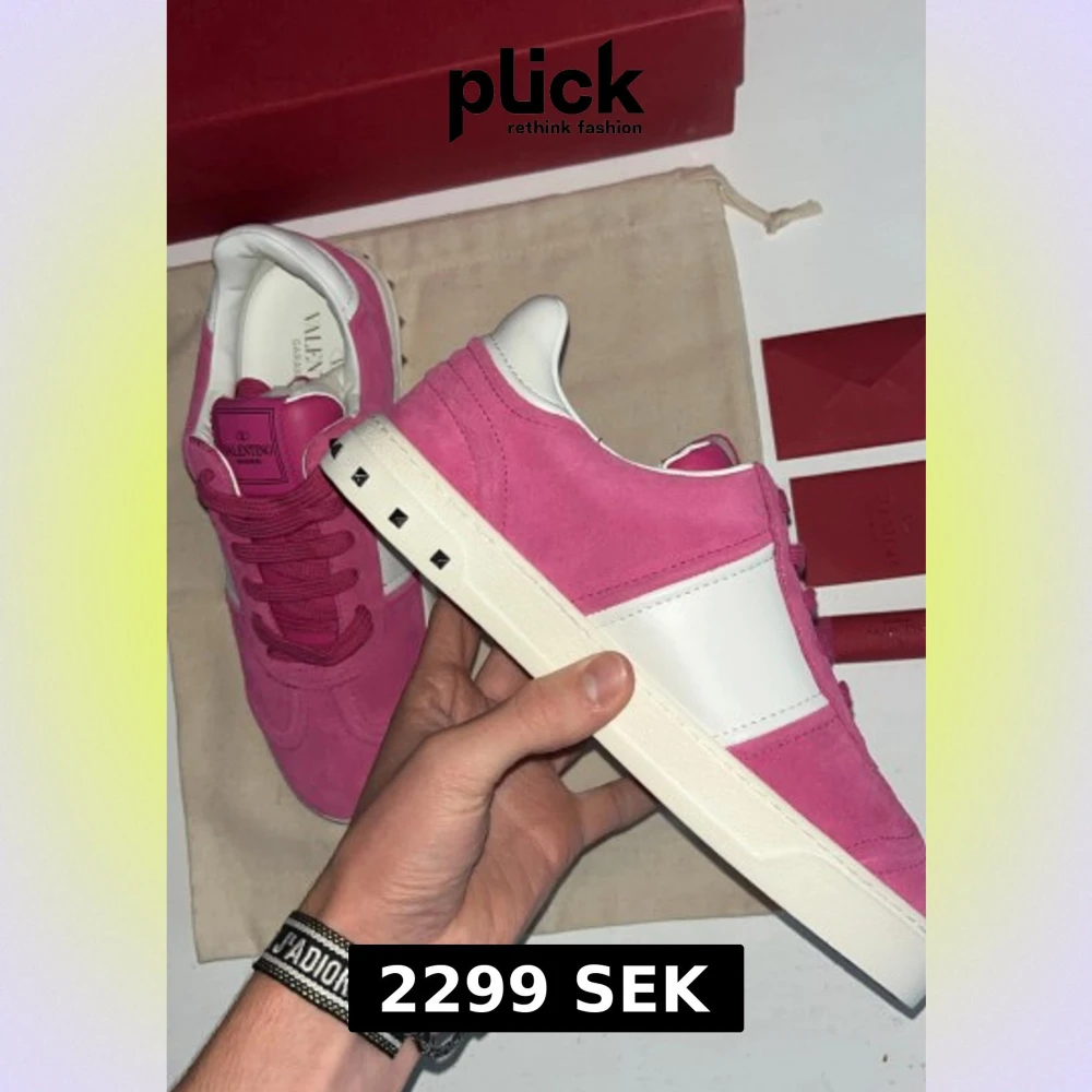 Snygga Valentino Garavani Open sneakers i rosa mocka med vita skinnpaneler och ikoniska nitar på sulan. Skorna har rund tå, platt sula och klassisk snörning. Perfekt statement-piece för dig som vill sticka ut med färg och lyxig känsla.