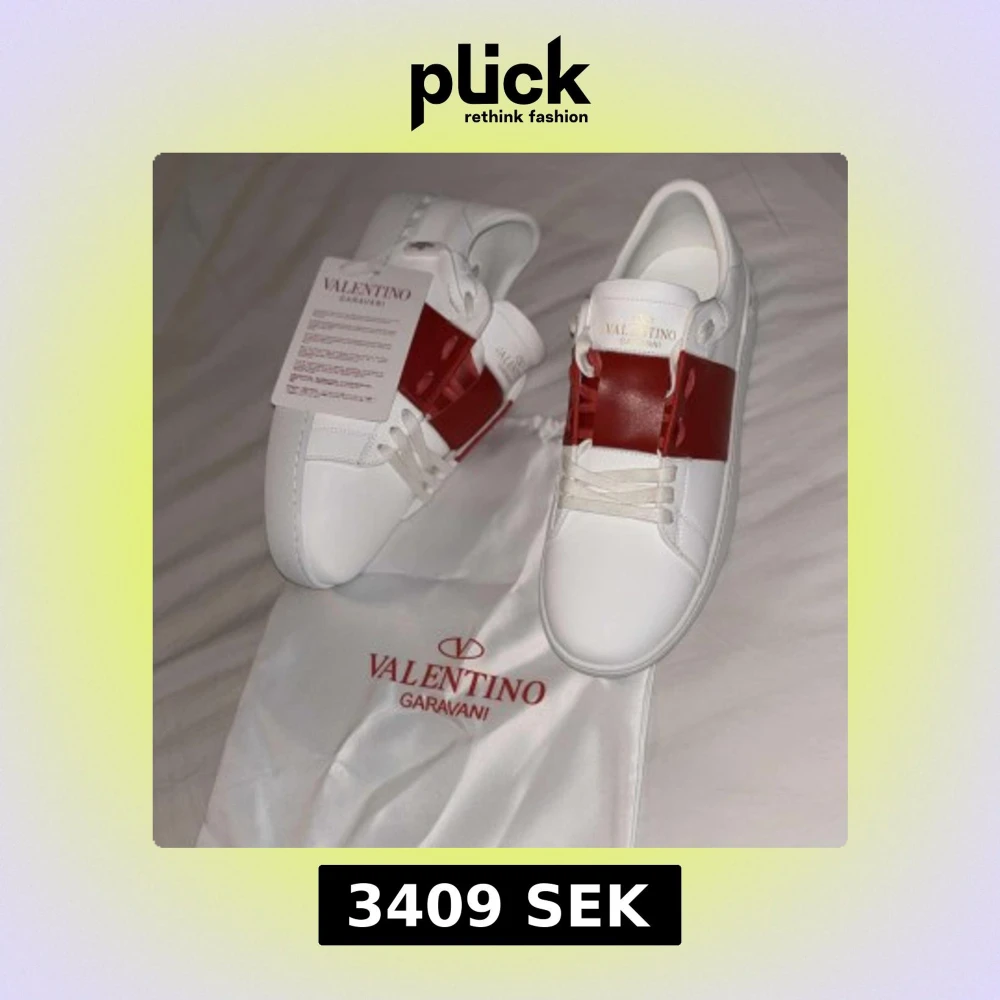 Helt nya, fräscha Valentino Garavani Open sneakers i vitt skinn med en bred vinröd läderdetalj över mitten. Klassisk rund tå, platt sula och coola nitar baktill på sulan. Skorna har vita snören och diskret logga på plösen. Perfekta för dig som gillar lyxig streetstyle.