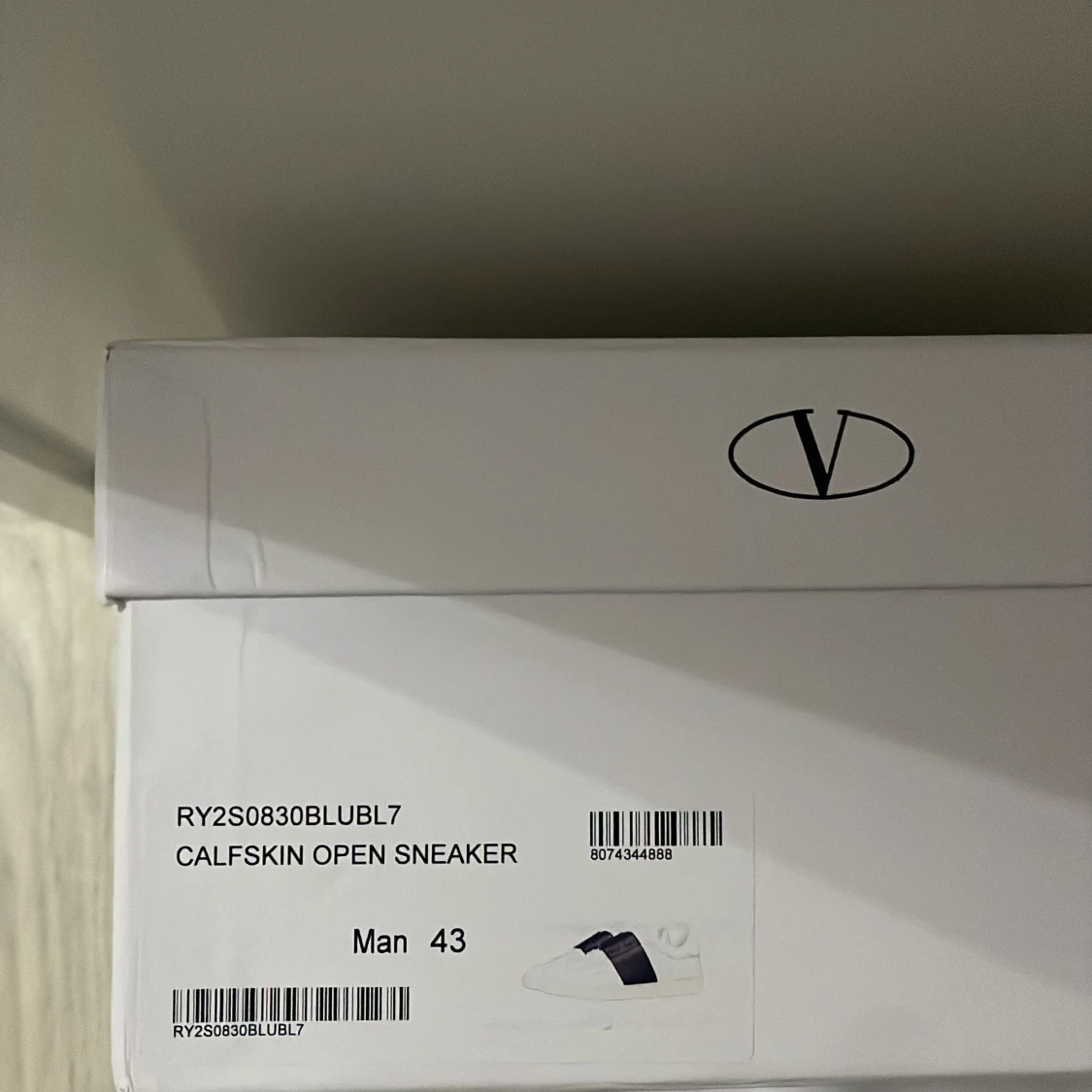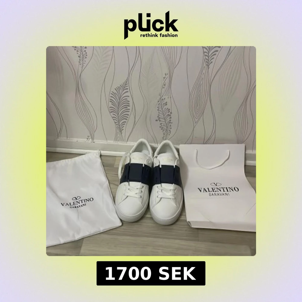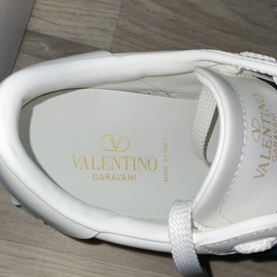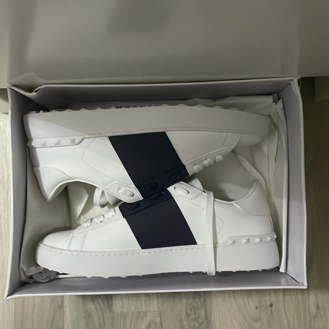 Säljer ett par lyxiga Valentino Garavani Open sneakers i vit kalvskinn med bred mörkblå rem över ovansidan. Snygg och stilren design med vita snören och subtila nitar på hälen. Kommer med originalpåse och låda. Perfekt för dig som gillar exklusiva sneakers. Priset går att diskutera