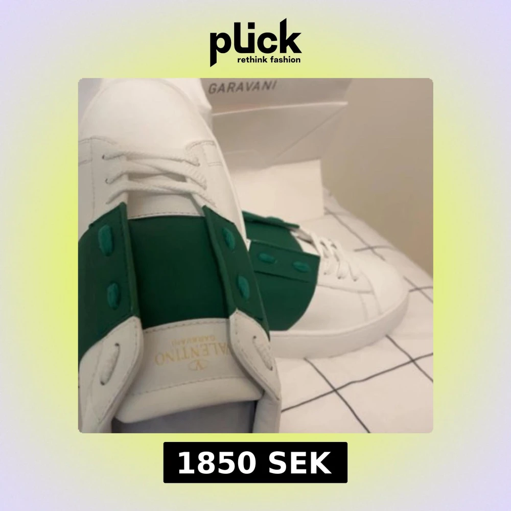 Snygga Valentino Garavani Open sneakers i vitt skinn med en bred grön läderpanel över snörningen. Klassisk rund tå och platt sula, med coola nitar på hälen. Perfekt för dig som vill sticka ut med stilrena och lyxiga sneakers.