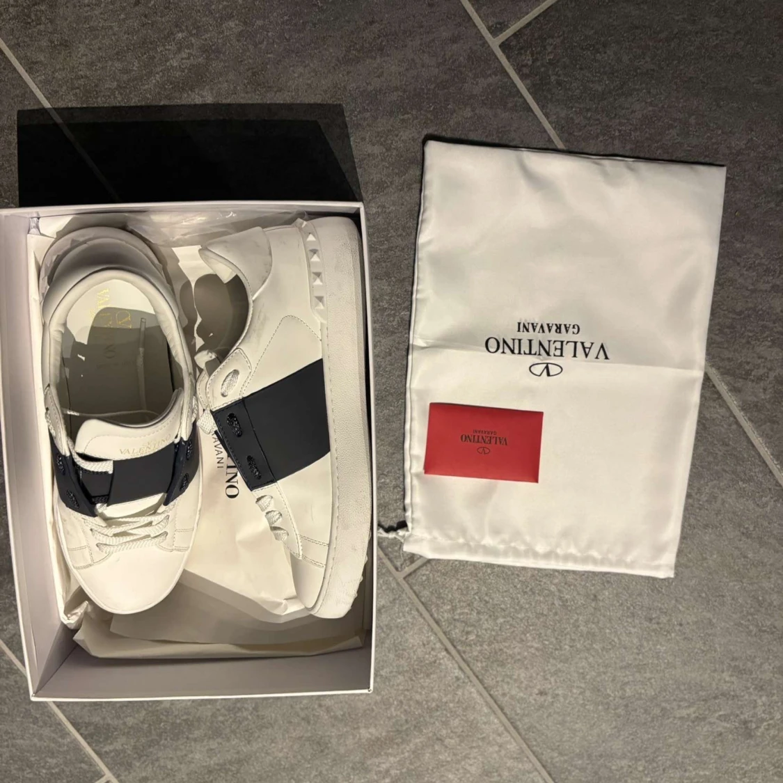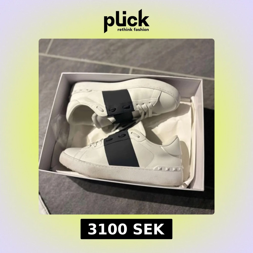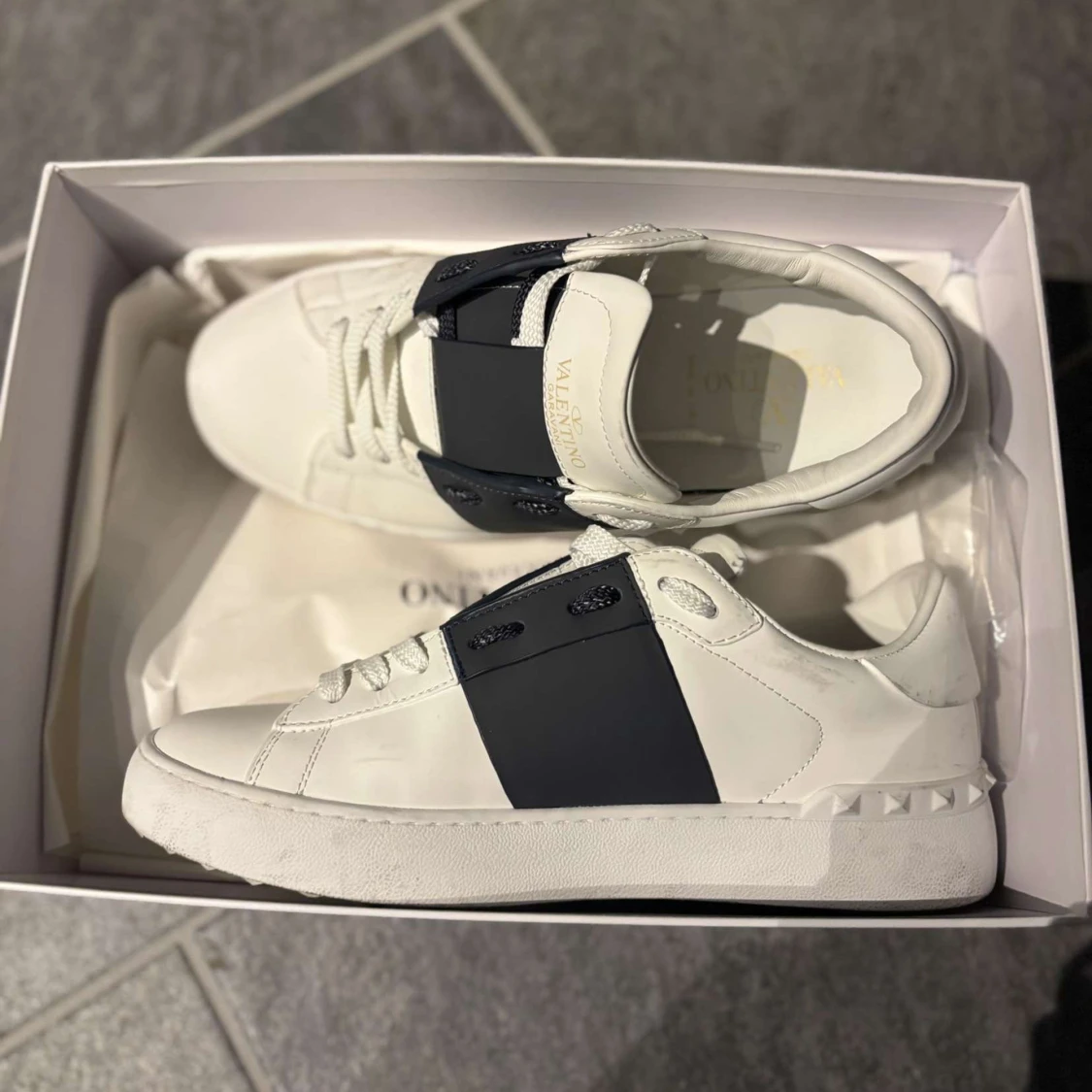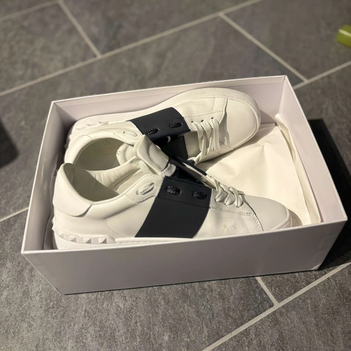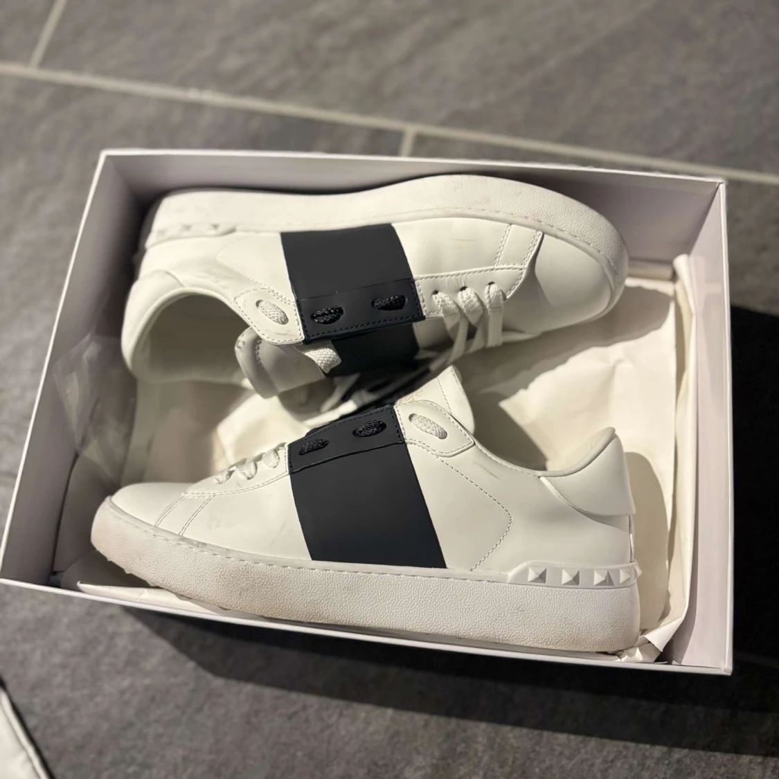 Snygga Valentino Garavani Open sneakers i vitt skinn med bred svart rem över vristen och coola nitar på hälen. Klassisk rund tå, vita snören och platt sula. Perfekta för dig som vill ha en stilren men edgy look. Då den dessutom inte passar. Dem är även i ett väldigt bra skick och är knappt använda. MVH arian