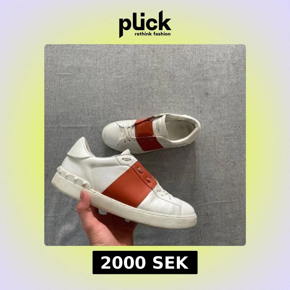 Snygga Valentino Garavani Open sneakers i vitt skinn med bred röd läderdetalj över mitten. Klassisk låg modell med snörning och ikoniska nitar på hälen. Perfekta för dig som vill sticka ut med exklusiva och trendiga sneakers.