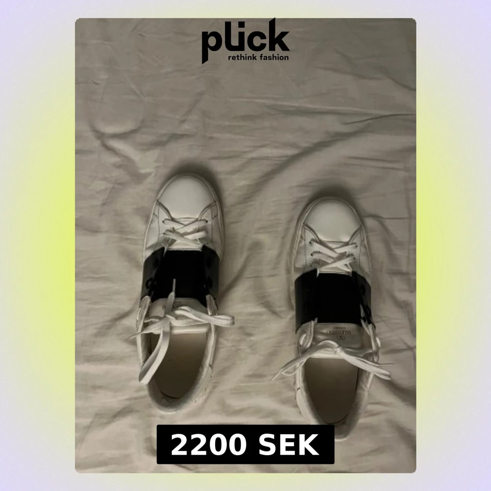 Säljer ett par snygga Valentino Garavani Open sneakers i vitt skinn med bred svart rem över mitten. Klassisk rund tå, platt sula och vita snören. Snygga nitar på hälen ger extra edge. Perfekt för dig som gillar lyxiga och stilrena sneakers.