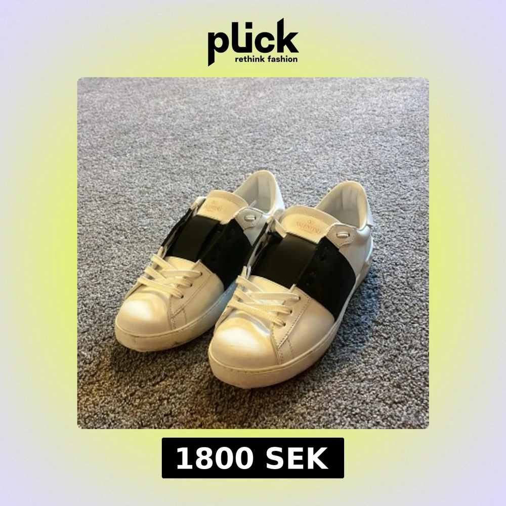 Snygga Valentino Garavani Open sneakers i vitt skinn med bred svart läderdetalj över vristen. Klassisk rund tå, vita snören och coola nitar baktill på sulan. Perfekta för dig som gillar stilrena och lyxiga sneakers med edge.