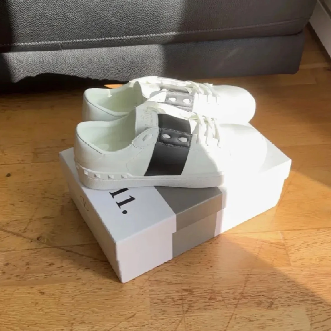 Snygga Valentino Garavani Open sneakers i vitt skinn med en bred svart läderdetalj över mitten och silverfärgade nitar. Klassisk rund tå och platt sula. Perfekta för dig som gillar exklusiva och stilrena sneakers med en edgy touch. Pris kan diskuteras