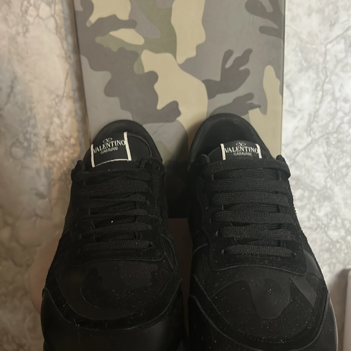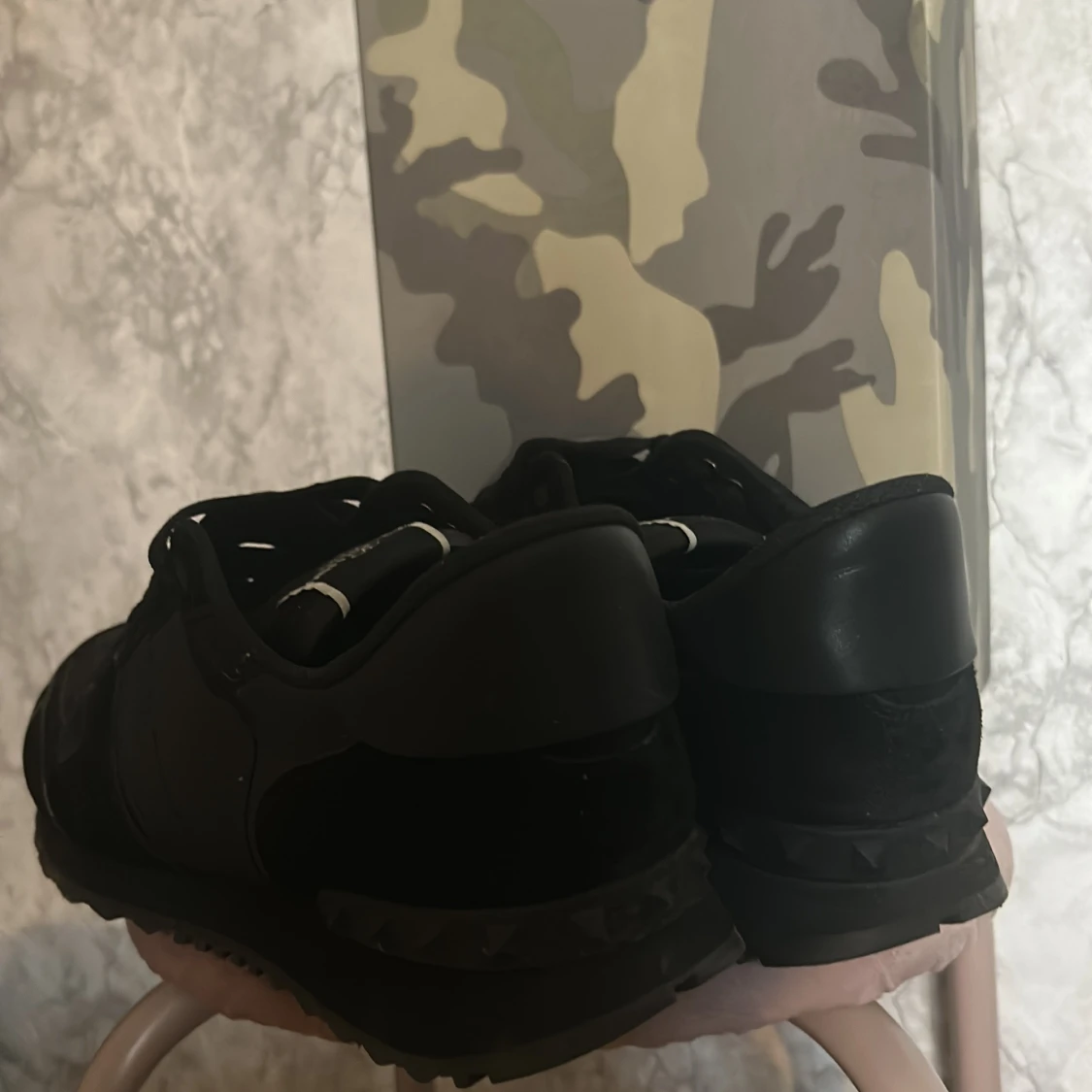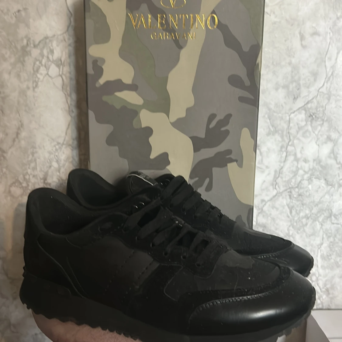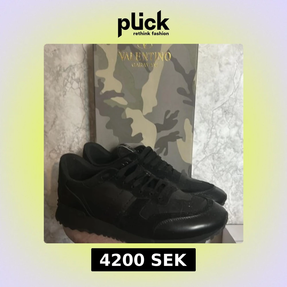 Snygga svarta Valentino Garavani rockrunners. Har knappt använt dem. Bra skick. Det ända dåliga är att kartongen e lite trasig men annars är de inget fel. Väldigt sköna till höst och vinter. Om du vill förhandla så skriv till mig så kommer vi på något nytt pris