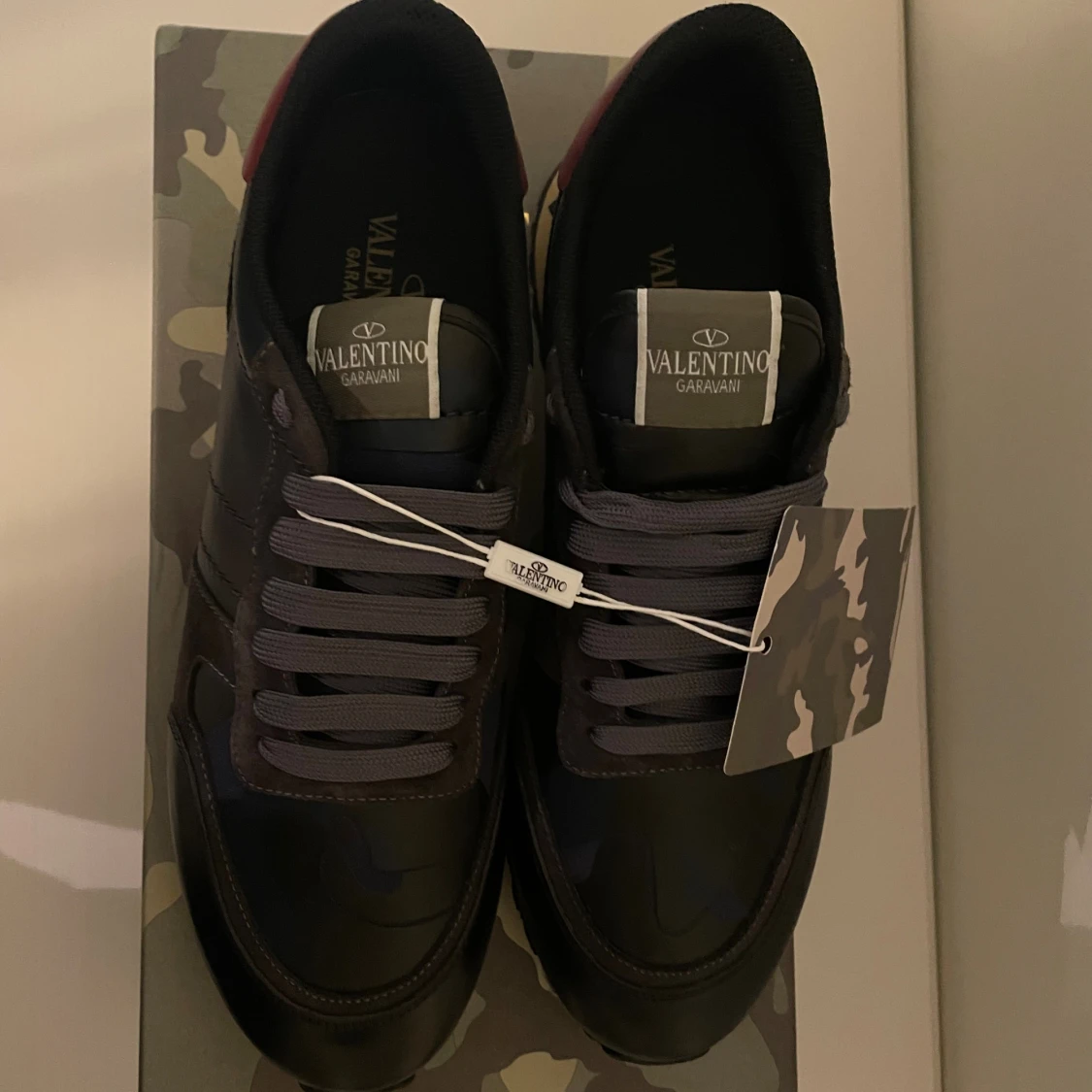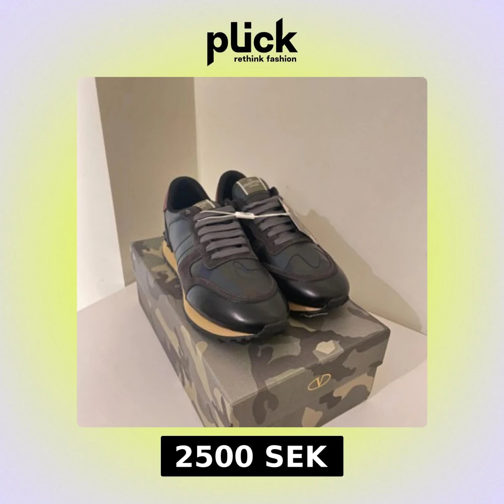 Snygga Valentino Garavani Rockrunner sneakers i svart och mörkgrått med röda detaljer på hälen. Skorna har en cool camouflagemönstrad box, platt sula och snörning. Materialmix av skinn och mocka ger en lyxig känsla och unik look.