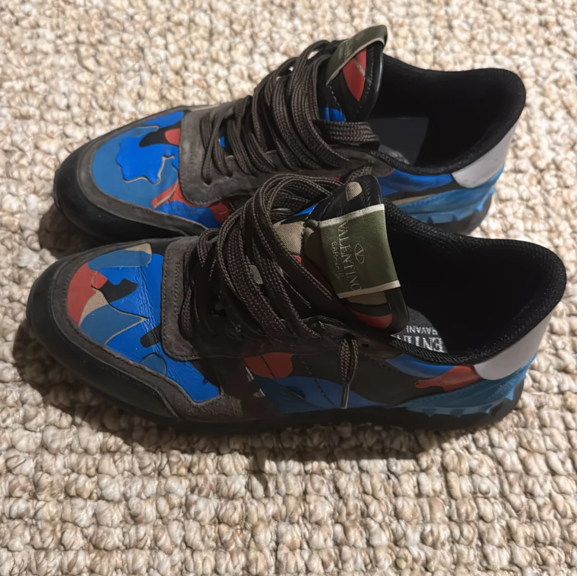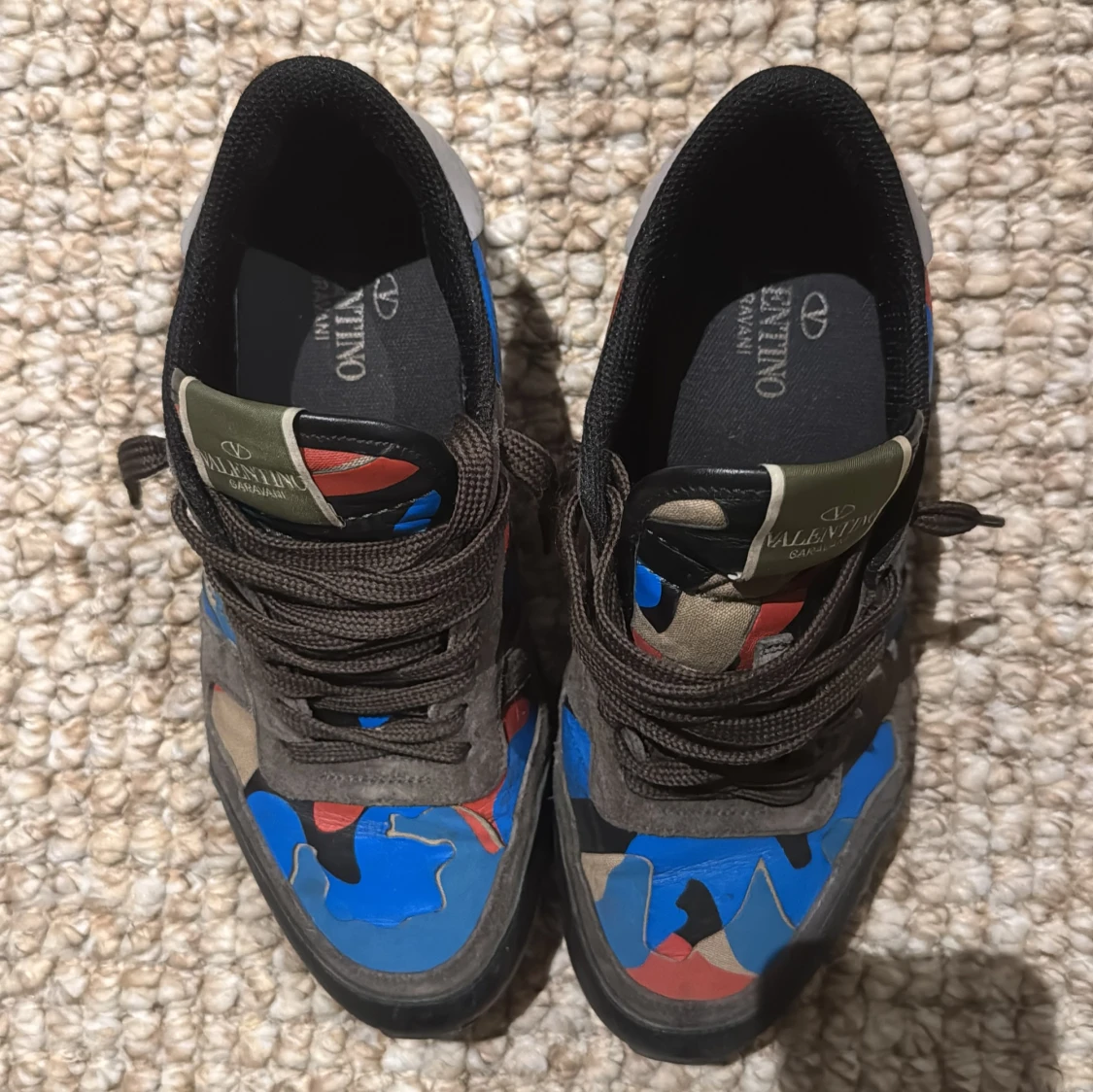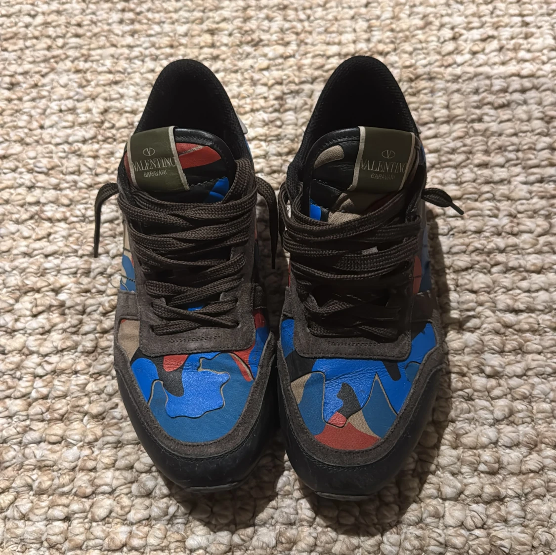 Säljer ett par Valentino Garavani Rockrunner sneakers med unik camouflage-mönstrad ovandel i blått, rött, beige och svart. Skorna har bruna mockadetaljer, svarta snören och robust gummisula. Perfekt för dig som vill sticka ut med exklusiva och färgstarka sneakers. Ingen box eller så, hör av er vid funderingar.