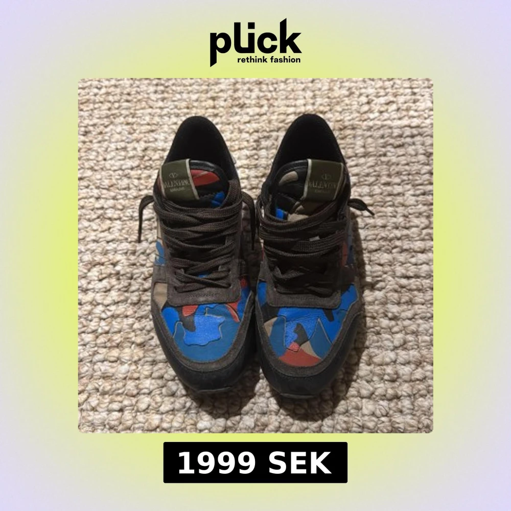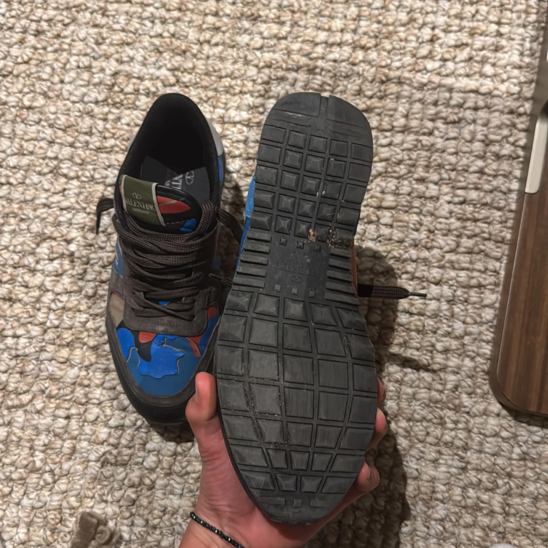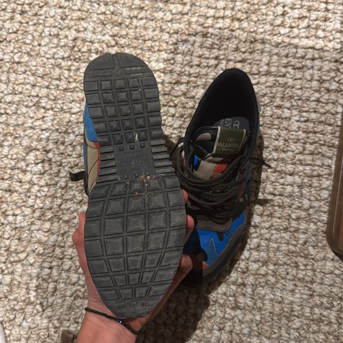 Säljer ett par Valentino Garavani Rockrunner sneakers med unik camouflage-mönstrad ovandel i blått, rött, beige och svart. Skorna har bruna mockadetaljer, svarta snören och robust gummisula. Perfekt för dig som vill sticka ut med exklusiva och färgstarka sneakers. Ingen box eller så, hör av er vid funderingar.