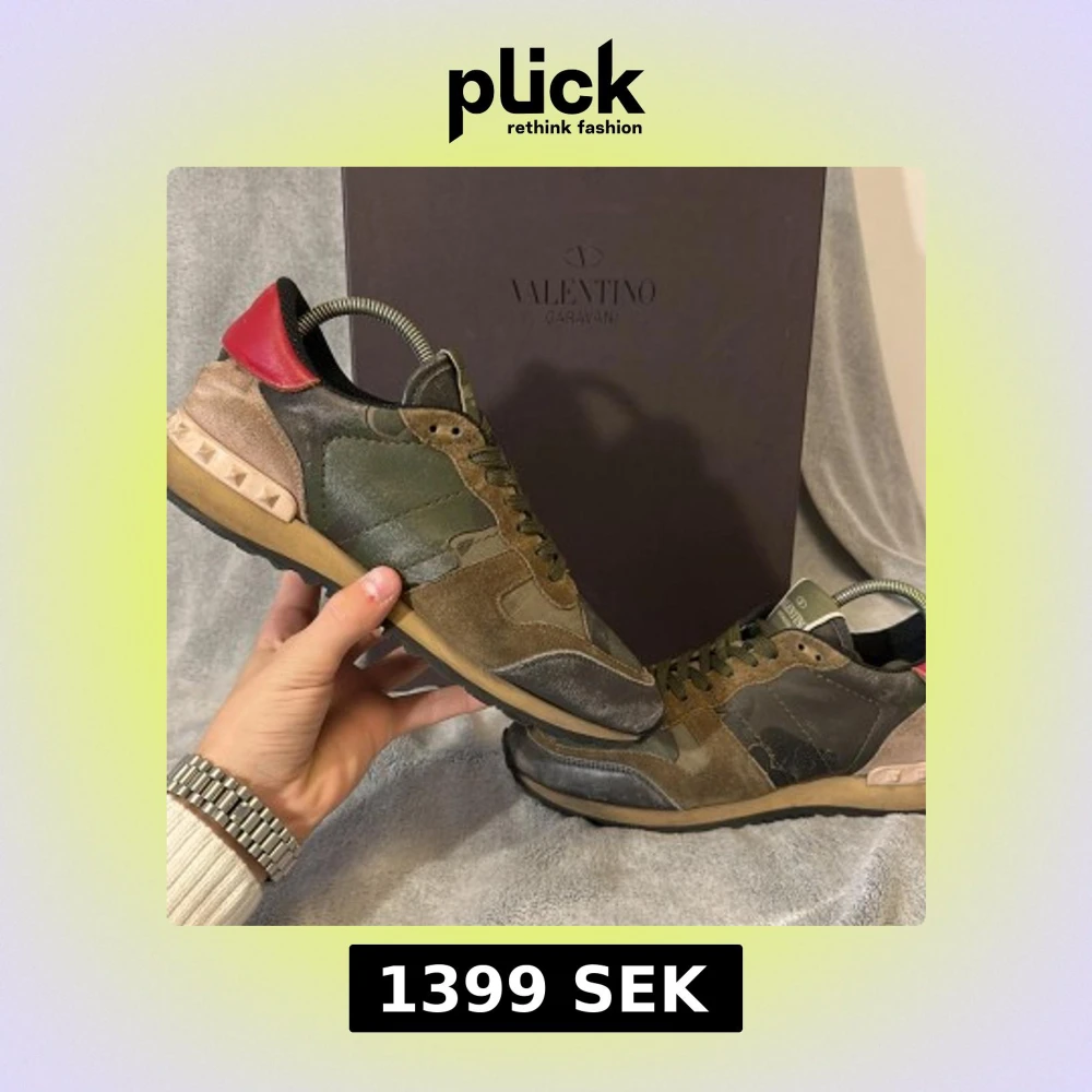 Snygga Valentino Garavani Rockrunner sneakers i camouflagemönster med inslag av grönt, brunt, svart och beige. Skorna har detaljer i mocka och skinn, samt en röd hälkappa och nitar på hälen. Klassisk snörning och robust gummisula för en cool streetstil. Box medföljer ej. Storlek 39 men skulle säga att de passar 40