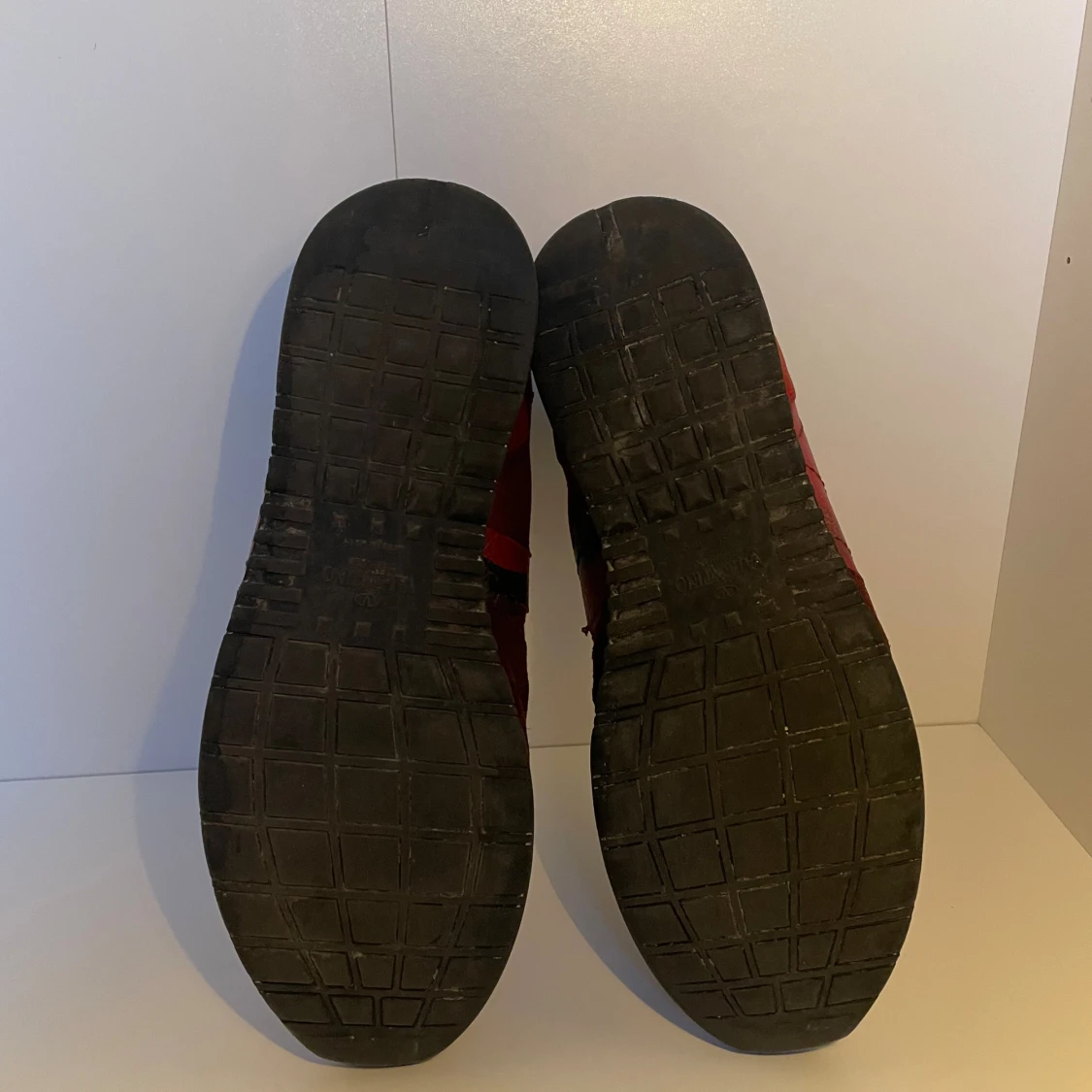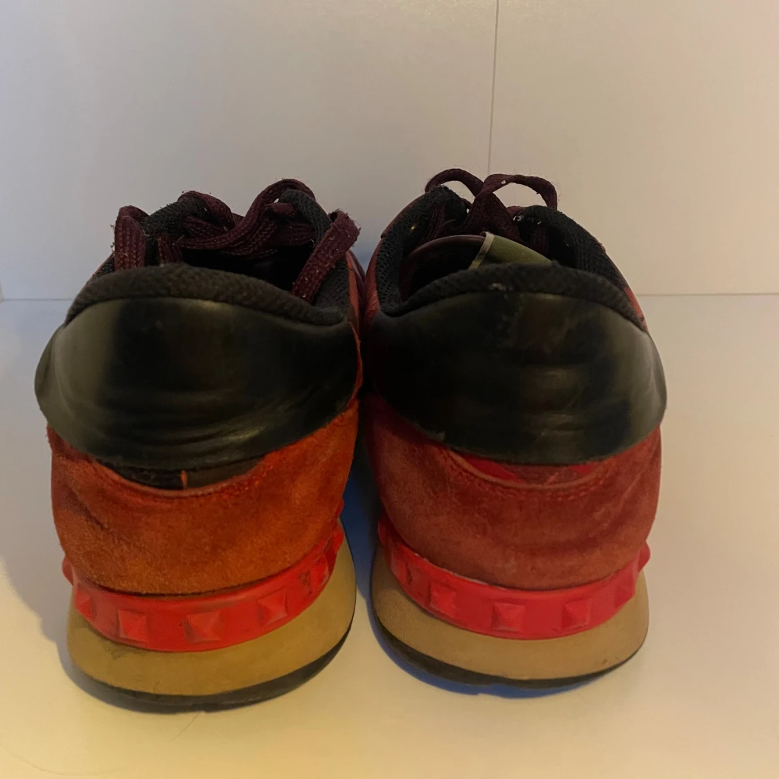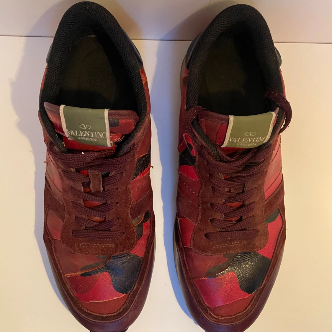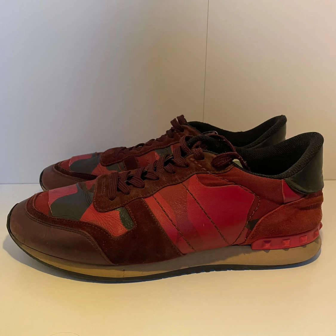 Tja nu säljer vi dessa riktigt snygga Valentino Garavani Rockrunner sneakers i vinrött och rött med coolt kamouflagemönster. Skorna har detaljer i mocka och skinn, svarta och röda inslag samt klassiska nitar på hälen. Bekväm platt sula och snörning framtill. Perfekta för dig som gillar statement-sneakers. Perfekta till hösten där med! Skick 7/10 finns små defekter på skinnet men inget som syns när den används, box osv ingår ej!! Hör av dig vid minsta lilla fråga! ✨🌟
