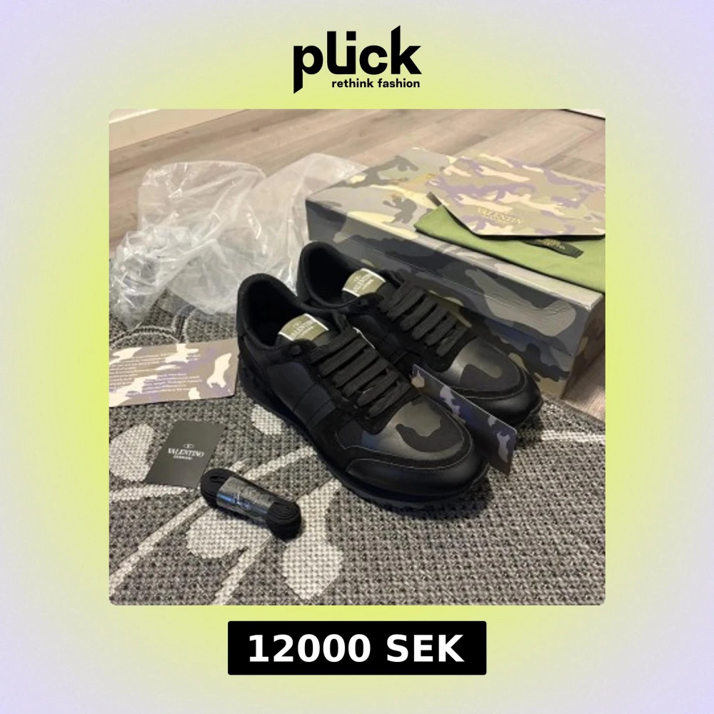 Svarta Valentino Garavani Rockrunner sneakers med coolt kamouflagemönster. Skorna har snörning, platt sula med nitar och detaljer i mocka och skinn. Märkeslogga på plösen och innersulan. Perfekt för dig som gillar exklusiv streetstyle.