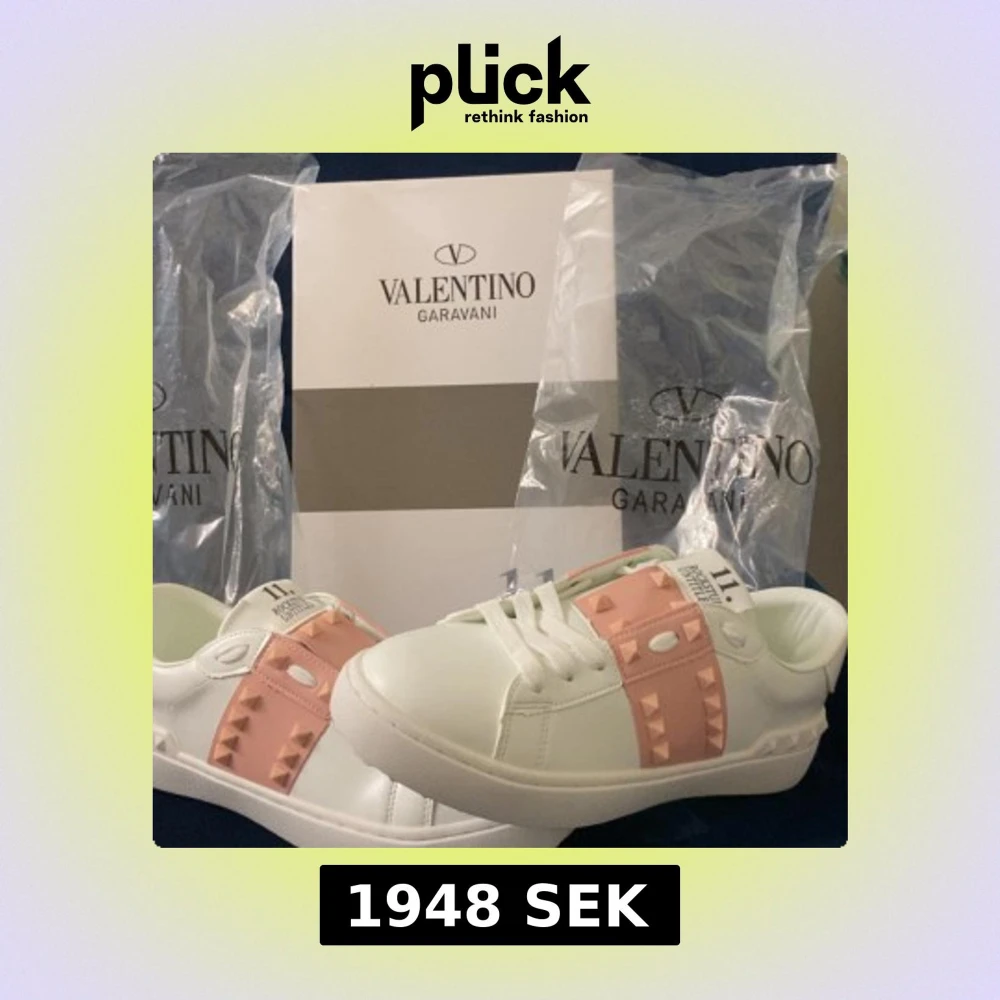 Snygga vita Valentino Garavani Rockstud sneakers med rosa detaljer och ikoniska nitar. Skorna har rund tå, platt sula och är gjorda i skinn. De har snörning framtill och coola nitar både på sidan och bak på sulan. Perfekta för dig som vill sticka ut med lyxig streetstyle.