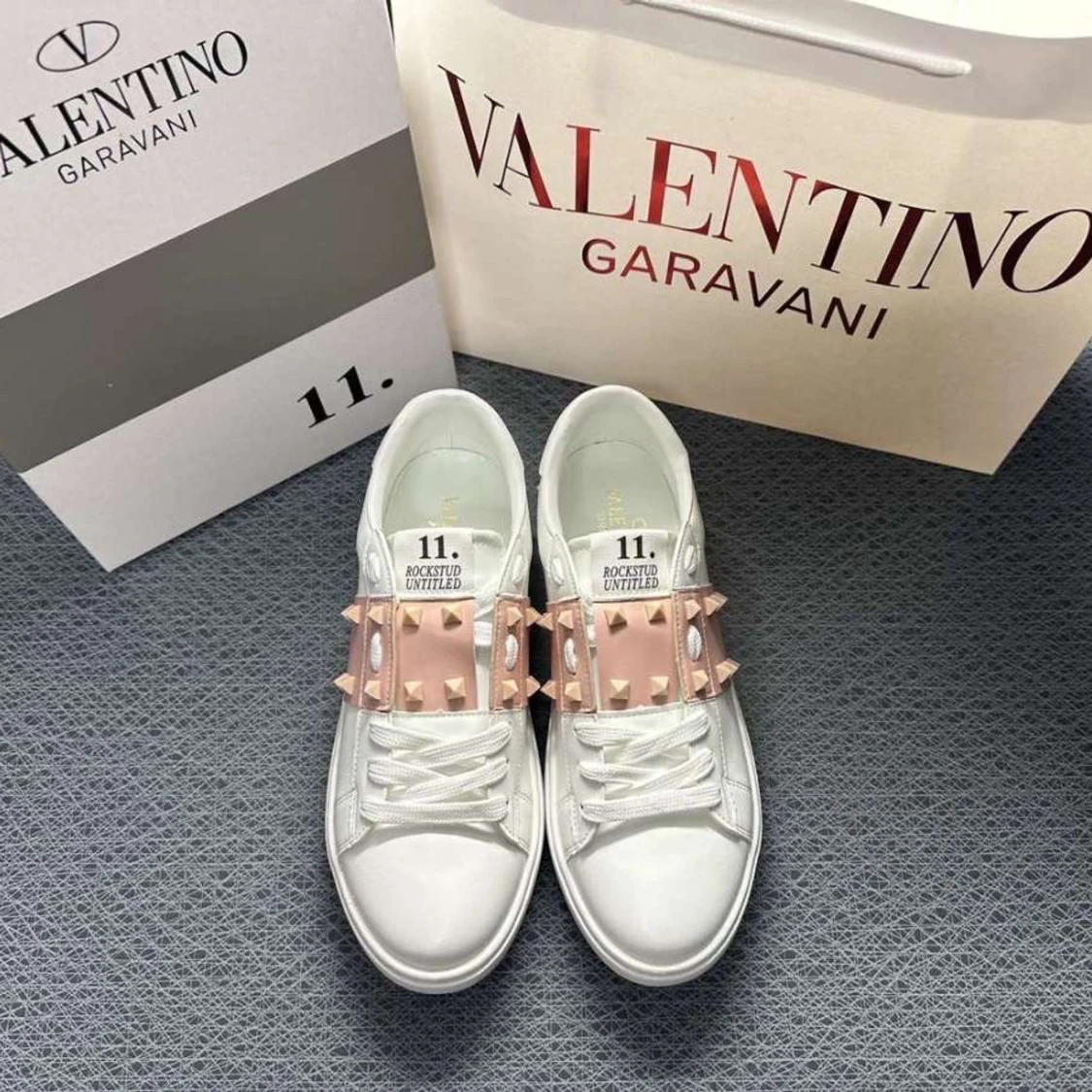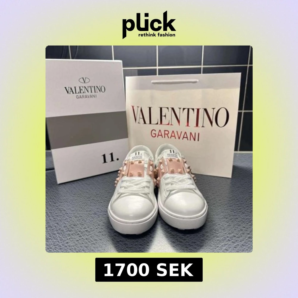 Snygga vita Valentino Garavani Rockstud sneakers med rosa band och ikoniska nitar. Skorna har rund tå, platt sula och snörning. Tillverkade i skinn med detaljer i ljusrosa och vita toner. Perfekta för dig som vill sticka ut med exklusiv streetstyle.