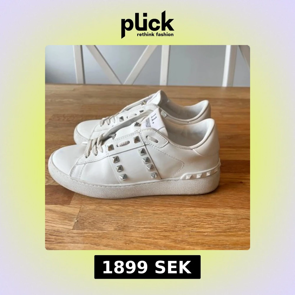 Snygga vita Valentino sneakers med silverfärgade nitar och snörning. Köpte dem av en tjej på vinted men dem satt tyvärr för litet på mig. Personen hade även tappat bort lådan så den medföljer tyvärr inte. Skorna är i jättebra skick bara lite smuts som är enekelt att ta bort