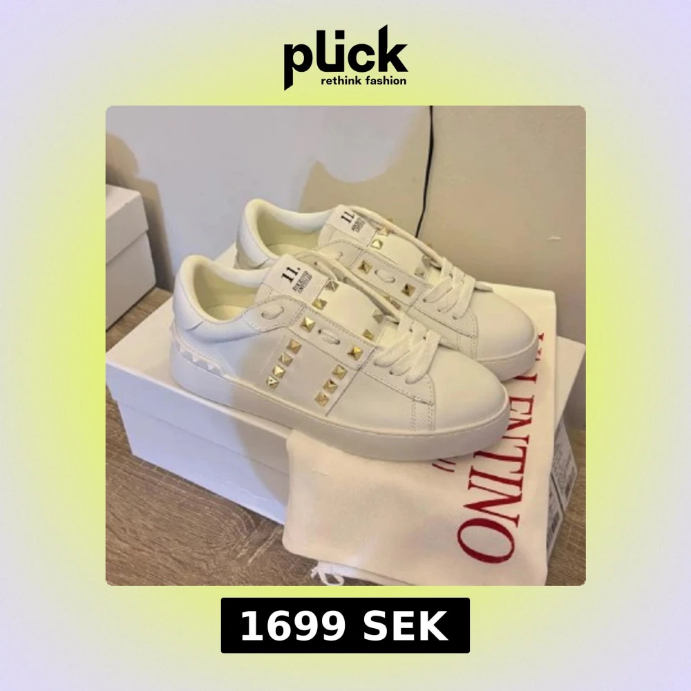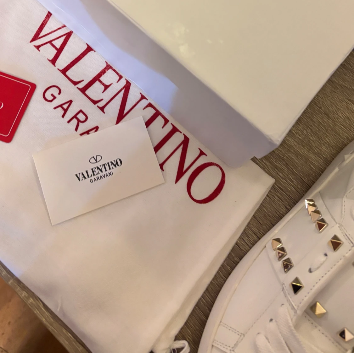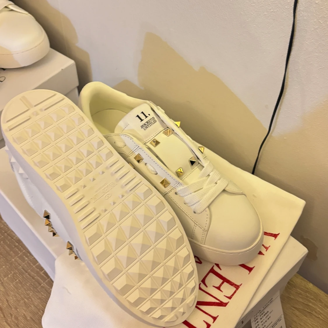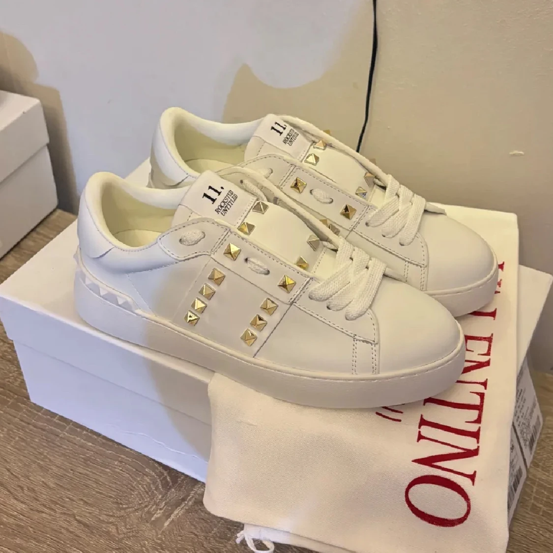 Snygga vita Valentino Garavani Rockstud sneakers med guld- och silverfärgade nitar längs sidorna. Skorna har rund tå, platt sula och är tillverkade i skinn med klassisk snörning. Perfekt för dig som gillar exklusiv och edgy stil.