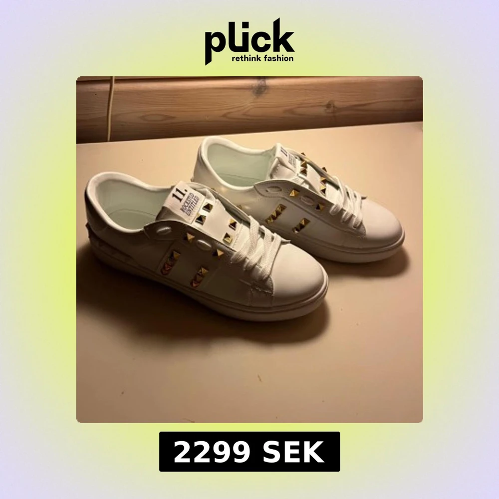 Snygga vita Valentino Garavani Rockstud sneakers i skinn med ikoniska guldiga nitar på sidorna och längs snörningen. Klassisk rund tå, platt sula och vita skosnören. Perfekta för dig som vill sticka ut med exklusiva detaljer och lyxig känsla.