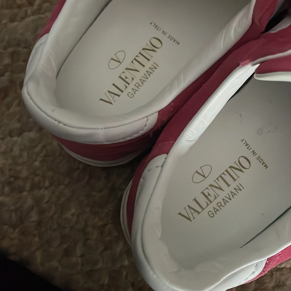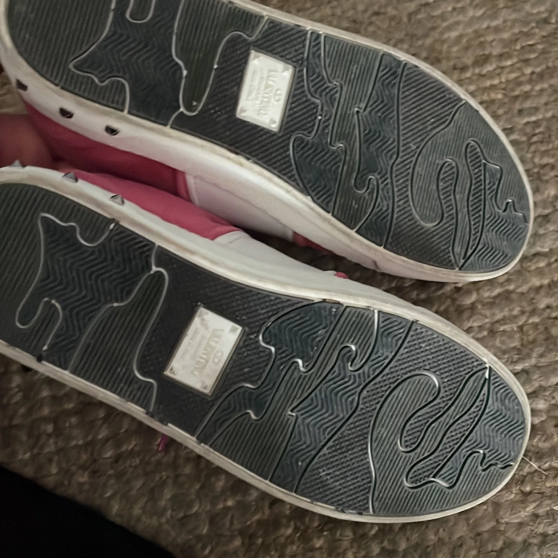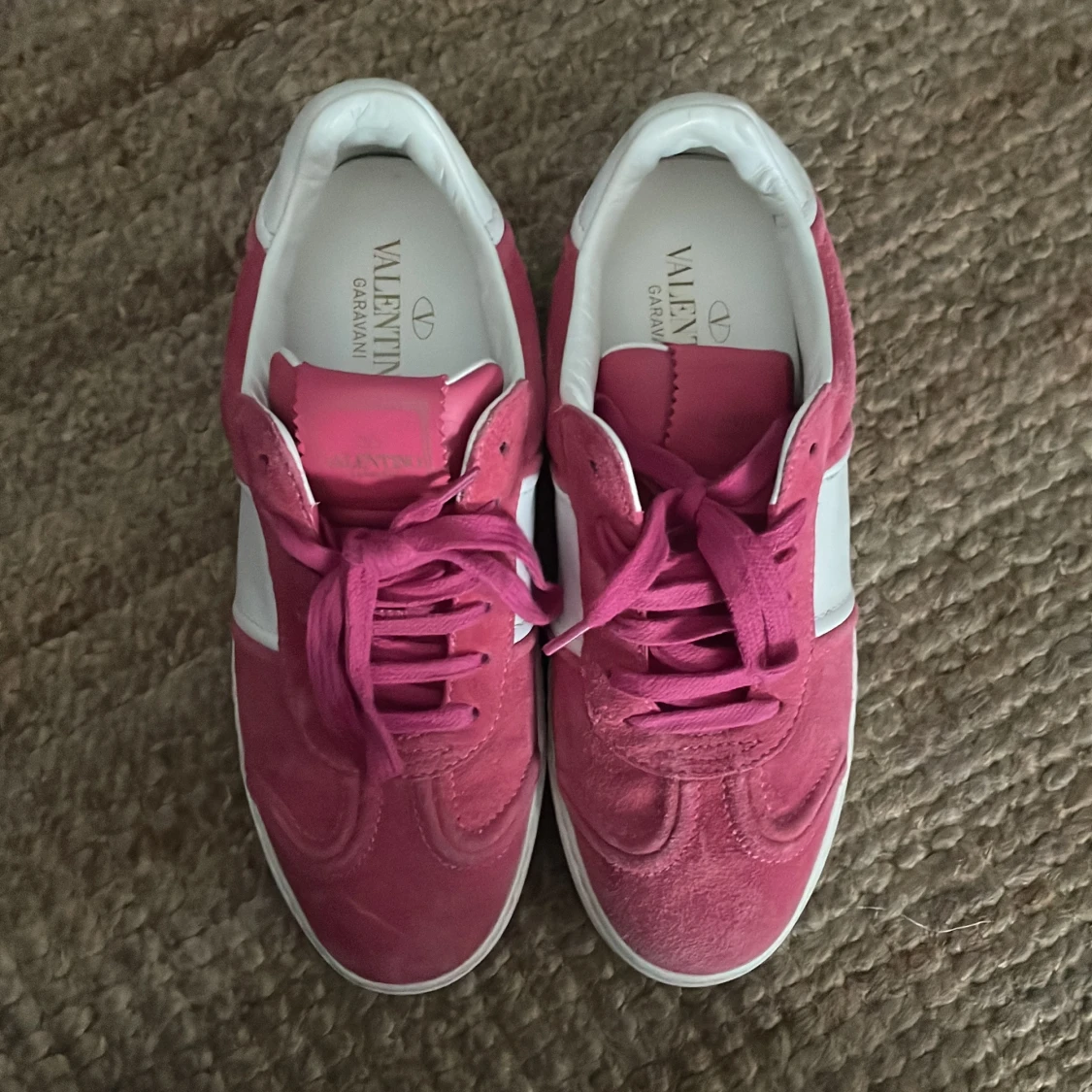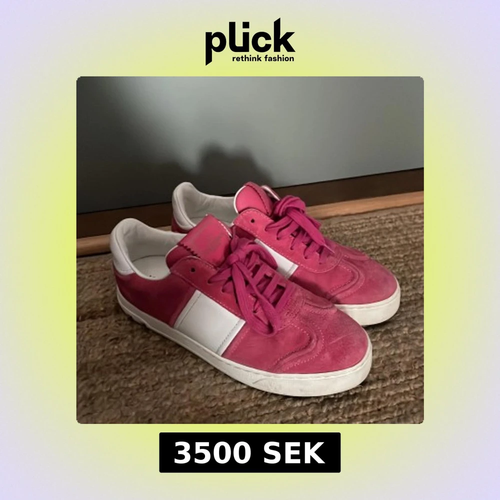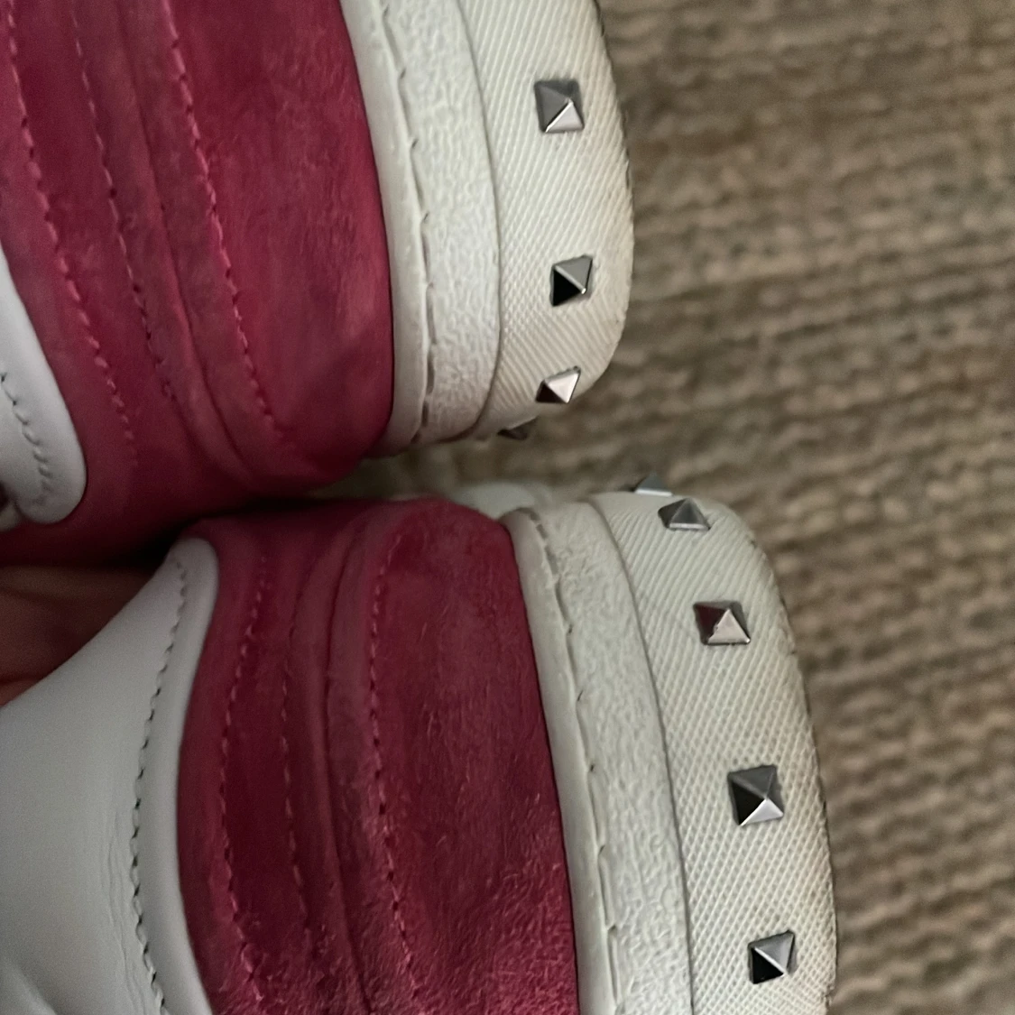 Snygga sneakers från Valentino Garavani i rosa mocka och vitt skinn. Skorna har klassisk snörning, vit sula och coola silverfärgade nitar på hälen. Kan diskutera priset vid snabb affär!🌸🩷